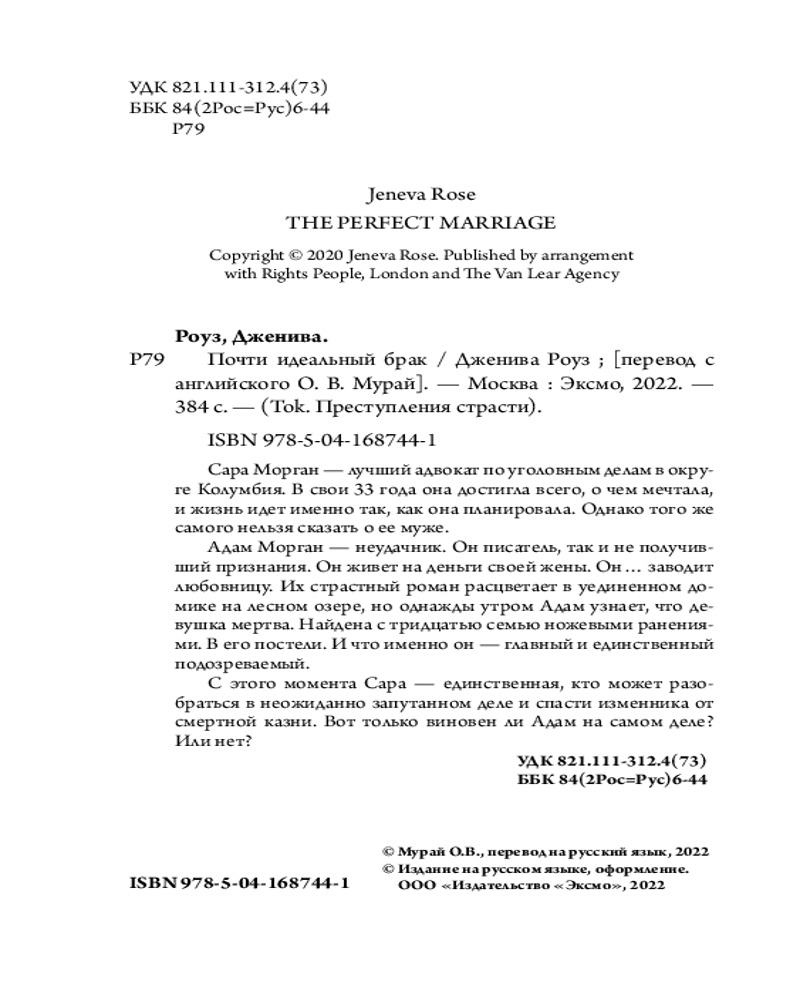 Но однажды утром все меняется. Адама арестовывают за убийство. Келли найдена с тридцатью семью ножевыми ранениями. В его постели... С этого момента Сара — единственная, кто может спасти Адама от смертной казни. Ей приходится взяться за свое самое сложное дело в своей практике: защищать в суде собственного мужа — человека, обвиняемого в убийстве своей любовницы. |