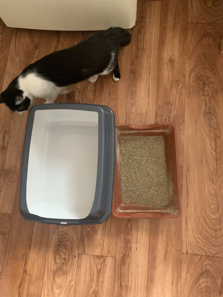Как взяли нашу Шкоду ( полгодика) с приюта , купили лоток. Выросла она и лоток стал мал. Дела иногда за борт, на кафель и тащит коврик , закрывает ковриком .😁 надеюсь теперь не будет с этим проблем 😊