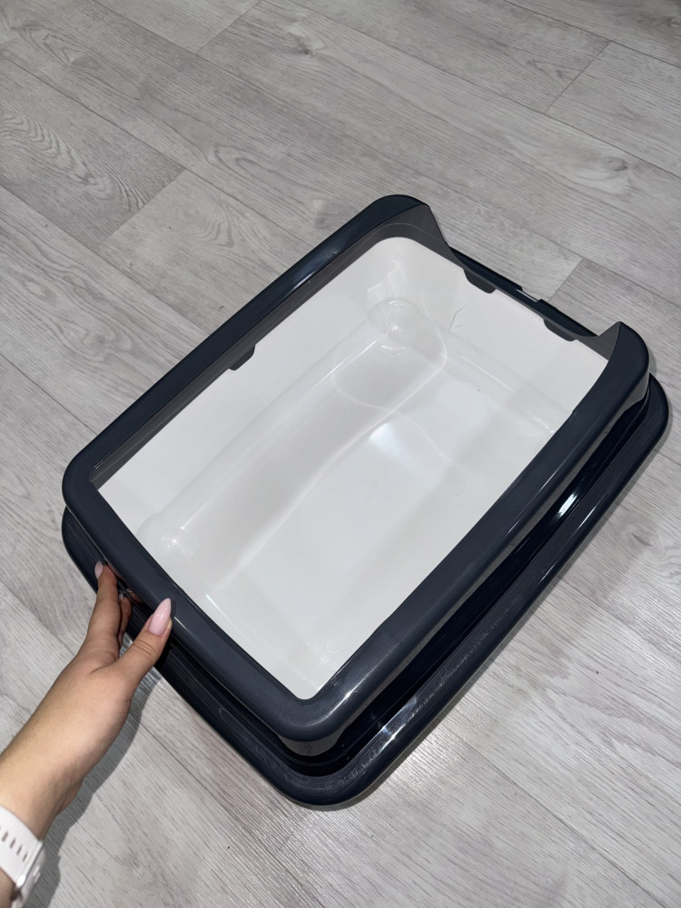 Ооочень большой и высокий лоток по сравнению с нашим предыдущим, похож на лотки-домики, только без верхушки Переживала, что мои котики его забоятся, но они с первого дня начали в него ходить без всяких проблем. Раньше половина лотка наполнителя у нас была на полу и все опилки растаскивались, теперь проблема решена полностью! Наша гребунья гребёт себе на радость, а на пол ничего не просыпается