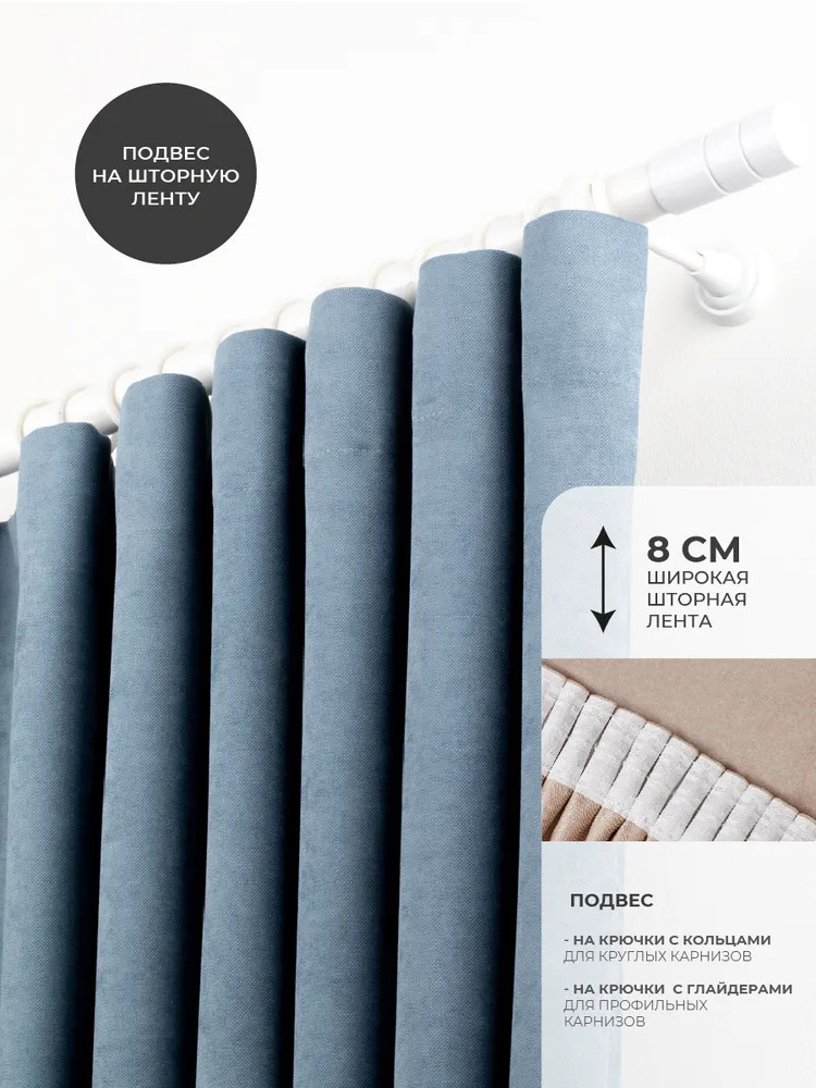 Однотонная портьера из велюра станет прекрасным дополнением к вашему интерьеру. Ткань достаточно плотная, приятная на ощупь, одинаково хорошо выглядит как с внешней, так и с изнаночной стороны. Изделие на шторной ленте шириной 8 см. Портьера со средней степенью затемнения, идеально подходят для спальни.