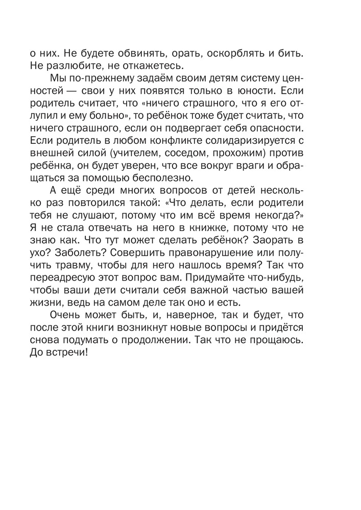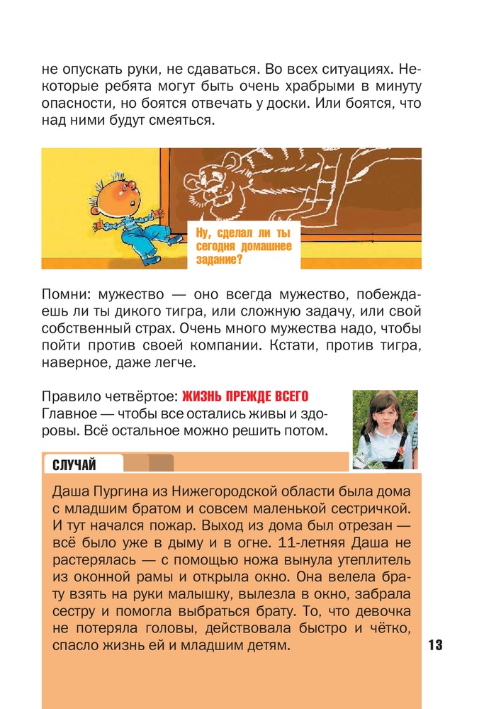 Книга информативна в том плане, что родителям порой бывает трудно на понятном для ребенка языке объяснить вроде как вещи само собой разумеющиеся. У детей рамки плохо- хорошо, опасно- безопасно размыты, им сложно понять, почему то или иное может стать угрозой их здоровью или даже жизни. Вот как раз для этого и нужна эта книга. Она объясняет доступно, понятно и просто, как, где и почему себя вести в трудных ситуациях. Однозначно, иметь всем родителям детей младших классов, читать, обсуждать и прорабатывать каждую ситуацию.