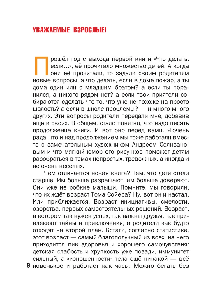Мы взяли обе книги серии "что делать если " и уже продублировали заказ для подарка. Моей дочке только 4 года и читать книгу такого содержания "не отрываясь" она ПОКА не может. НО книга просто ценнейшая! Мне казалось я все объяснила на счет того, как могут нехорошие люди воспользоваться ее доверием или бессилием и что нужно делать, ан нет! Оказывается, я упустила очень многие вещи - к примеру ЧТО КОНКРЕТНО нужно кричать, если тебя силой уводят, или В КАКУЮ СТОРОНУ нужно бежать, если ты увидел, что незнакомец уводит кого-то со двора. И так можно сказать относительно любой из глав этой книги! Обязательно приобретите ее для своих детей, и не забывайте ее читать и обсуждать!