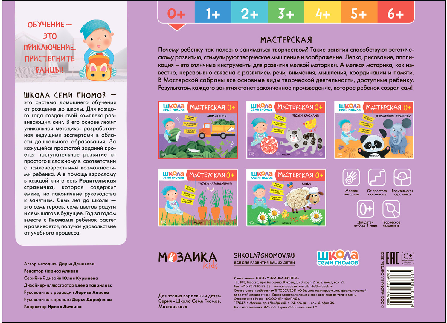 Книга «Аппликация 0+» из серии «Школа Семи Гномов. Мастерская» — это красочный альбом для занятий аппликацией с ребенком от рождения до 1 года. Занятия на близкие и понятные ребенку темы расположены по мере усложнения: поступательно переходя от освоения простых навыков к более сложным заданиям, ребенок научится создавать аппликацию с помощью бумаги и клея. |