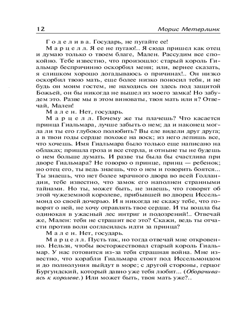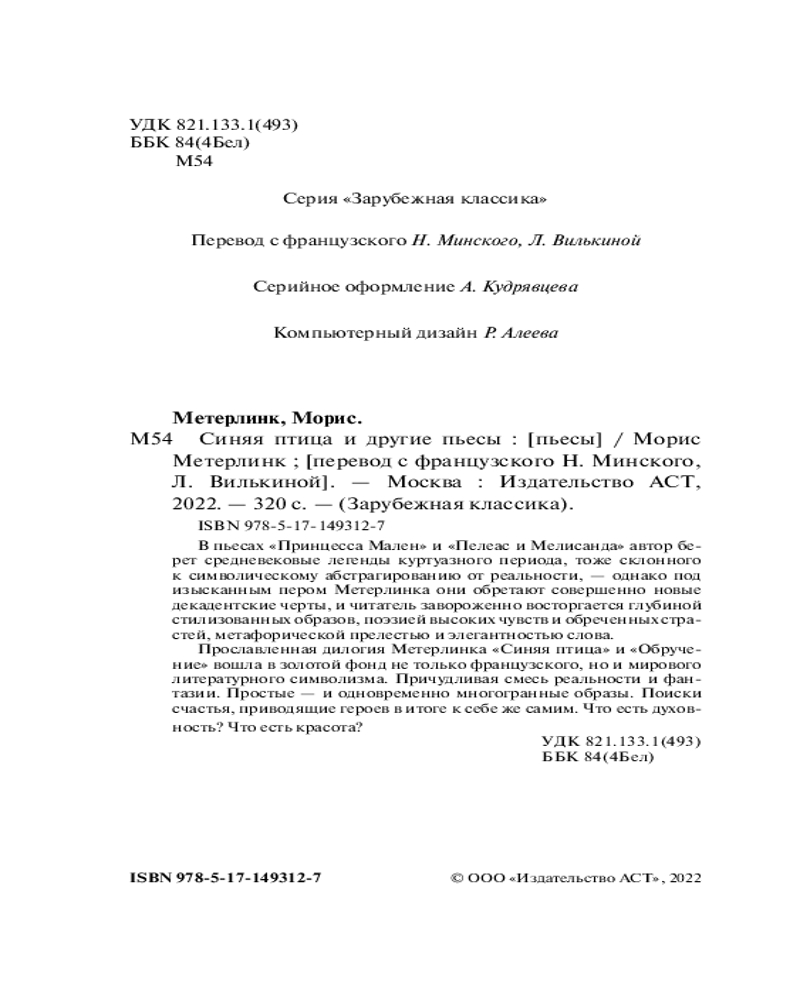 Синяя птица и другие пьесыВ данный момент этот товар отсутствует в продаже. Возможно, у нас найдется аналогичный или похожий товар здесь. Серия: Зарубежная классика В пьесах «Принцесса Мален» и «Пелеас и Мелисанда» автор берет средневековые легенды куртуазного периода, тоже склонного к символическому абстрагированию от реальности, — однако под изысканным пером Метерлинка они обретают совершенно новые декадентские черты, и читатель завороженно восторгается глубиной стилизованных образов, поэзией высоких чувств и обреченных страстей, метафорической прелестью и элегантностью слова. |