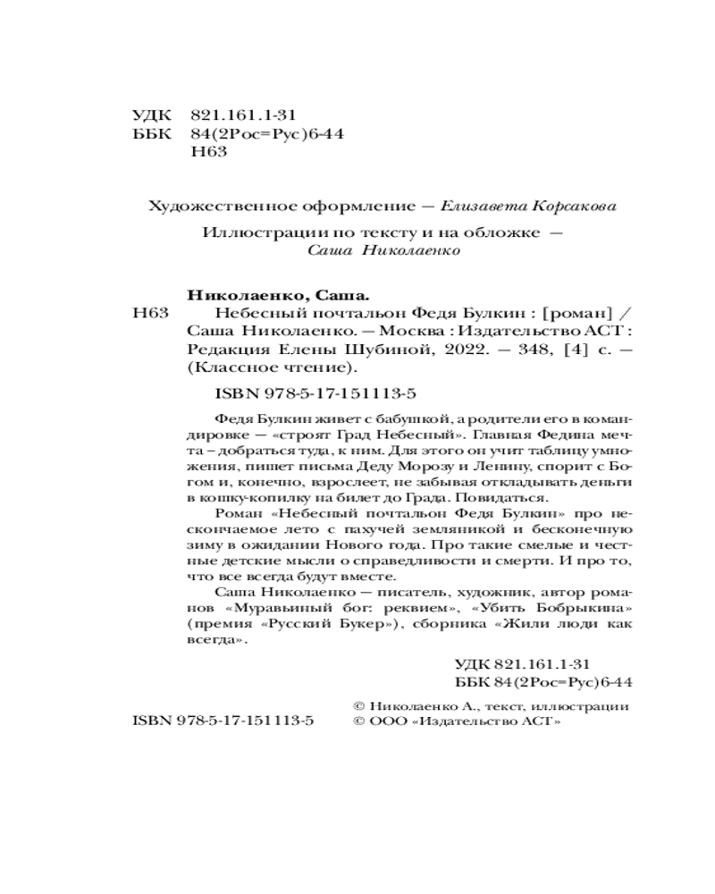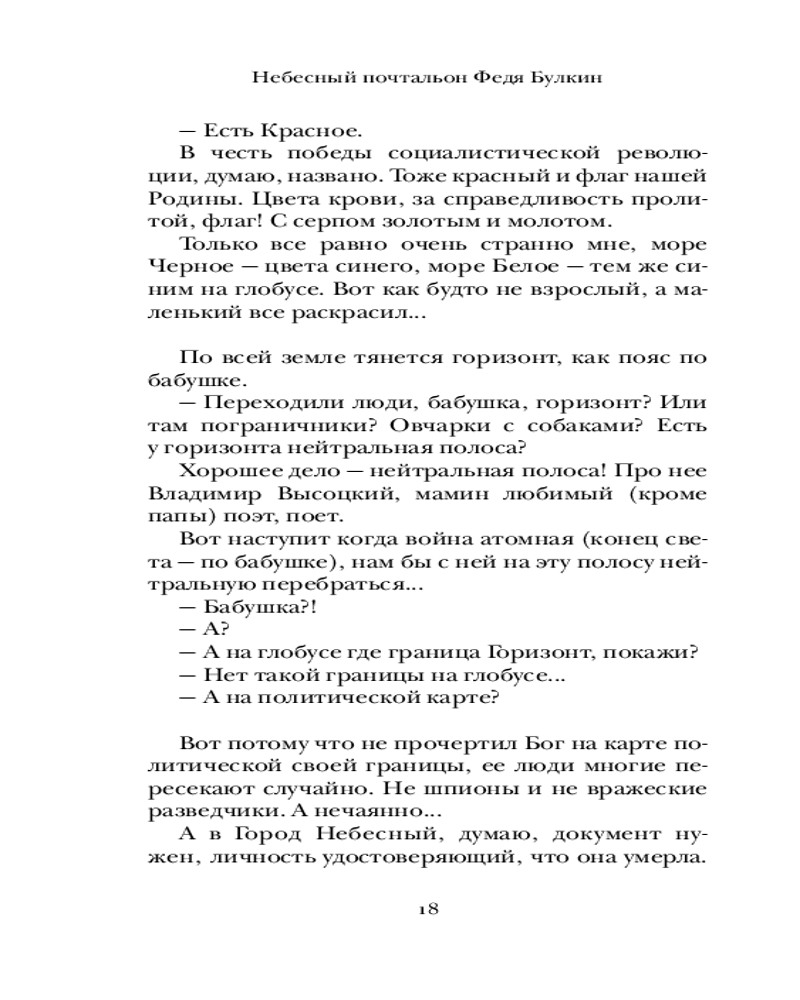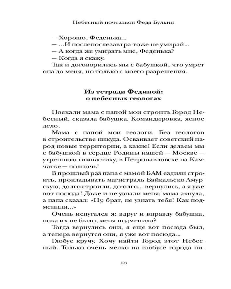 Небесный почтальон Федя БулкинАлександра Вадимовна Николаенко В данный момент этот товар отсутствует в продаже. Возможно, у нас найдется аналогичный или похожий товар здесь. Серия: Классное чтение Федя Булкин живет с бабушкой, а родители его в командировке — «строят Град Небесный». «Родители мои геологи. Без геологов в строительстве никуда». Главная Федина мечта — добраться туда, к ним. Для этого он учит таблицу умножения, пишет письма Деду Морозу и Ленину, спорит с Богом и, конечно, взрослеет, не забывая откладывать деньги в кошку-копилку на билет до Града. Повидаться. |