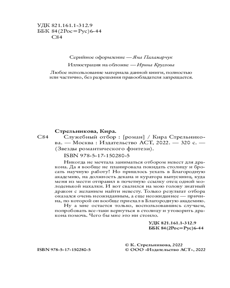 💳 Оплатить за товар можно при получении 🇰🇿 Есть бесплатная доставка по Казахстану от 1 дня 🎁 Копите бонусы с каждой покупки Серия: Звезды романтического фэнтези Никогда не мечтала заниматься отбором невест для дракона. Да я вообще не планировала покидать столицу и бросать научную работу! Но пришлось уехать в Благородную академию, на должность декана и куратора выпускниц, куда меня из мести отправил в почетную ссылку отец одной молоденькой нахалки. И вот свалился на мою голову знатный дракон с желанием найти невесту. Только результат отбора оказался очень неожиданным, а еще неожиданнее — причина, по которой он вообще приехал в Благородную академию. |