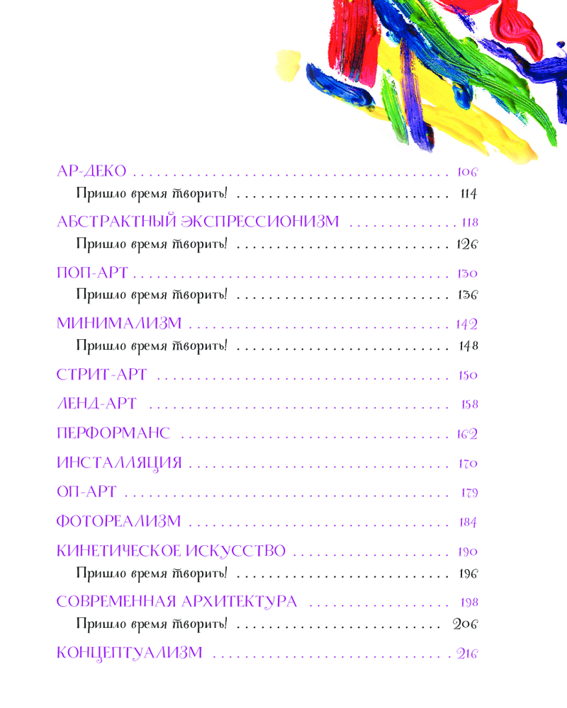 В книге «Современное искусство детям: от модерна до Бэнкси» мы расскажем вам и вашему ребёнку о современном искусстве: необычных стилях рисования и художниках-фантазёрах, новых взглядах на геометрию зданий и ленд-арте, творчестве без материальной формы и мастерстве изменять даже саму природу. В занимательной и понятной форме вы познакомитесь с теорией, да, бесчисленное множество стилей и идей можно объединить, а также сможете использовать творческое вдохновение и создать свои шедевры, используя разные стили, материалы и даже собственное тело!