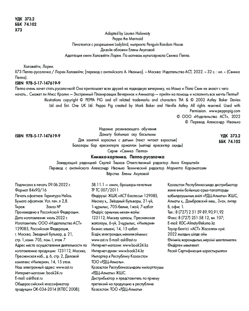 💳 Оплатить за товар можно при получении 🇰🇿 Есть бесплатная доставка по Казахстану от 1 дня 🎁 Копите бонусы с каждой покупки Серия: Свинка Пеппа Пеппа очень хочет стать русалочкой! Она приглашает всех друзей на подводную вечеринку, но Мама и Папа Свин не знают с чего начать... Сможет ли Мисс Кролик — Экстренный Планировщик Вечеринок и Аниматор — прийти на помощь и исполнить все мечты Пеппы? |