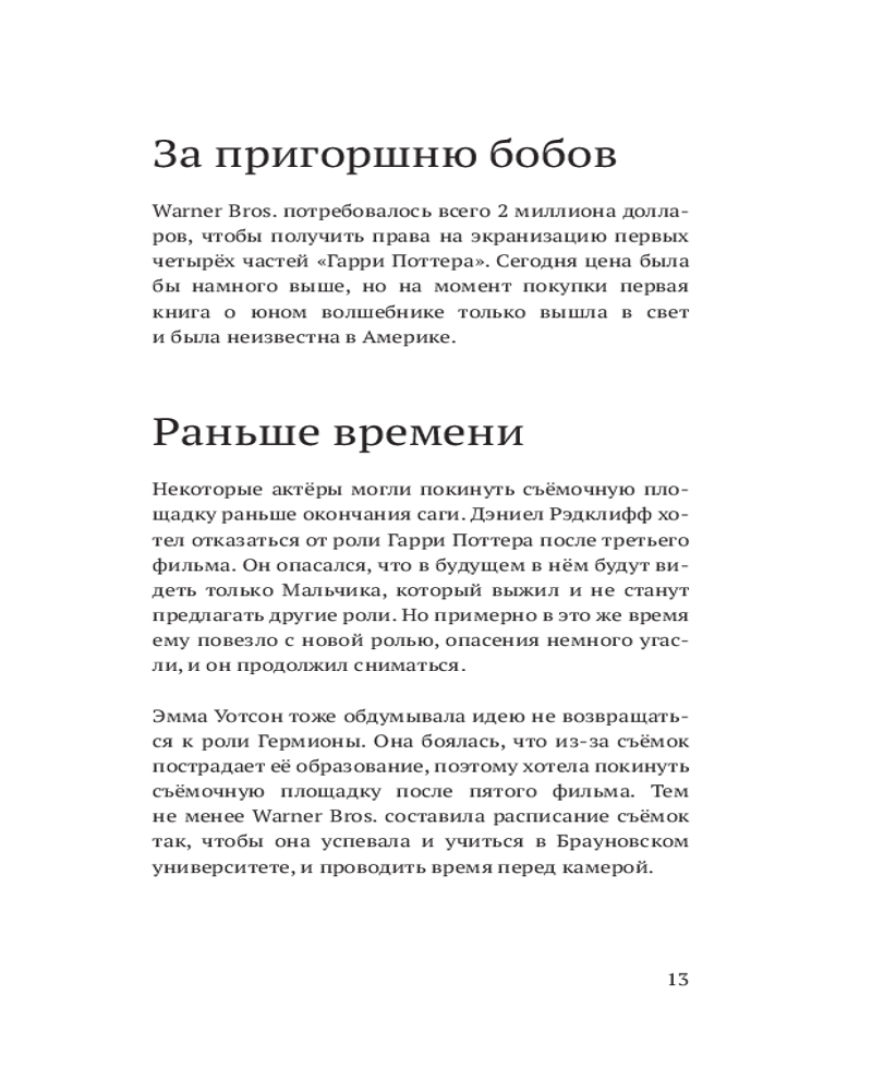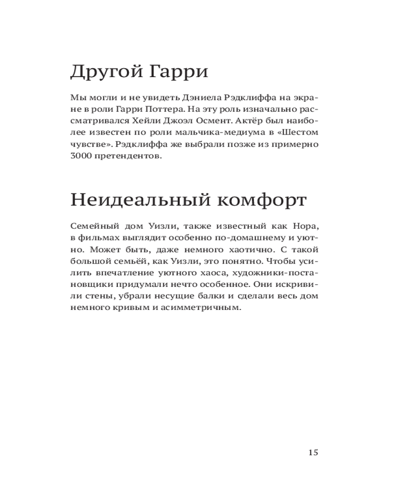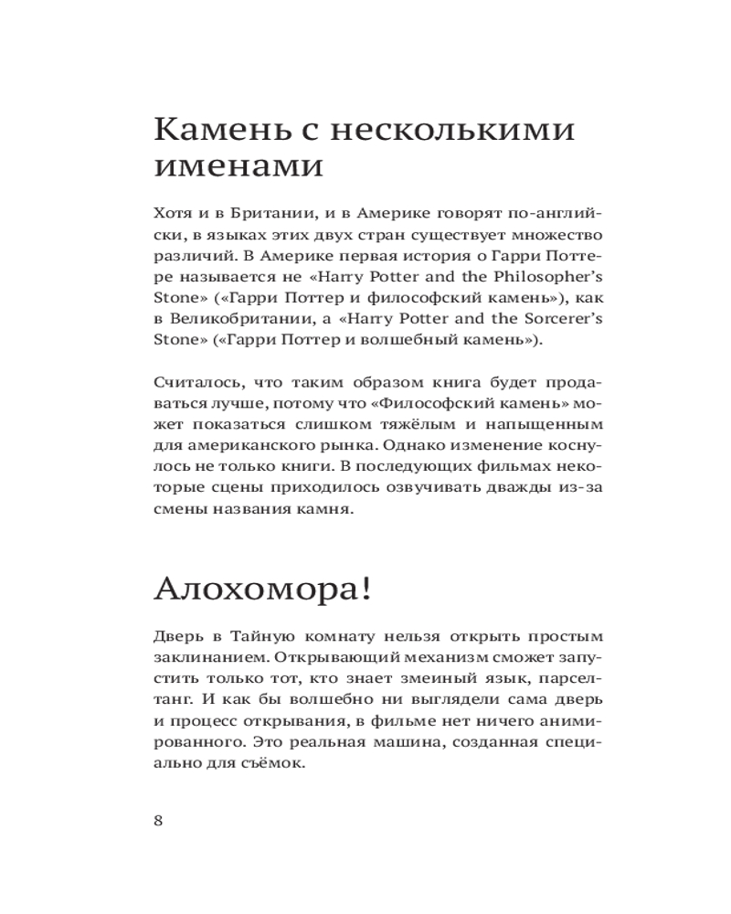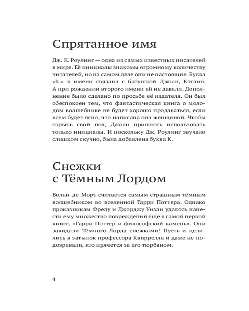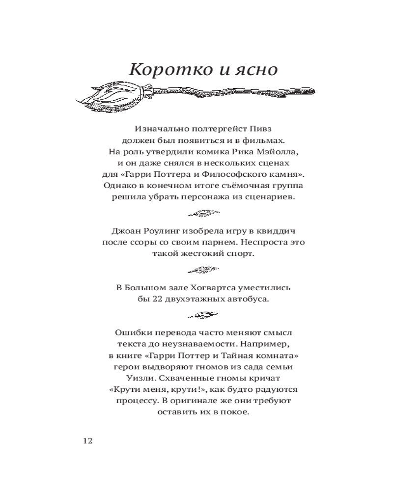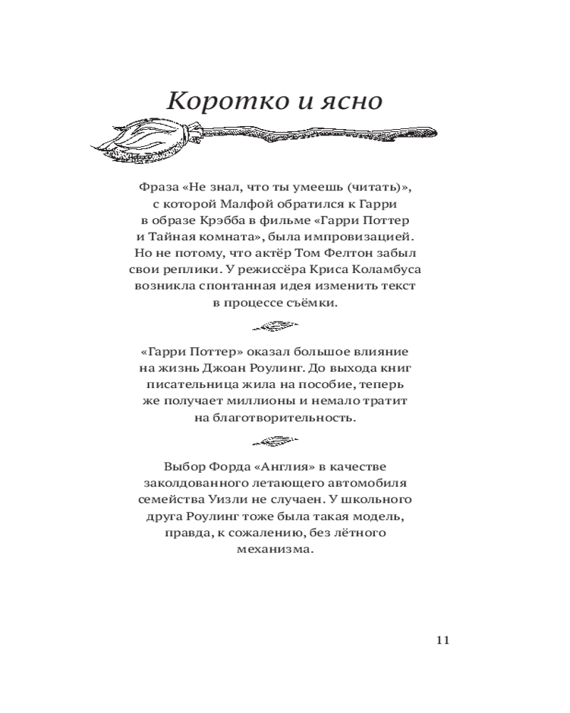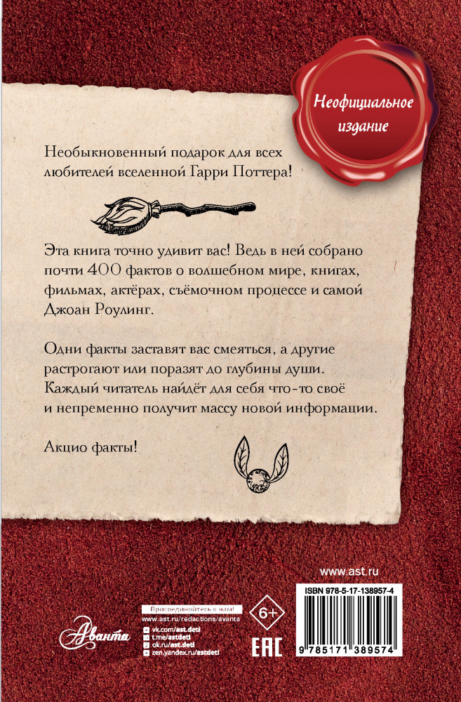 В этом неофициальном издании читателей ждут почти 400 фактов о любимом мире: о волшебниках и волшебстве, книгах, фильмах, актёрах и, разумеется, самой главной колдунье — Джоан Роулинг. Весёлые, грустные, странные, удивительные, восхитительные — даже самый заядлый поттероман найдёт здесь что-то новое и интересное.