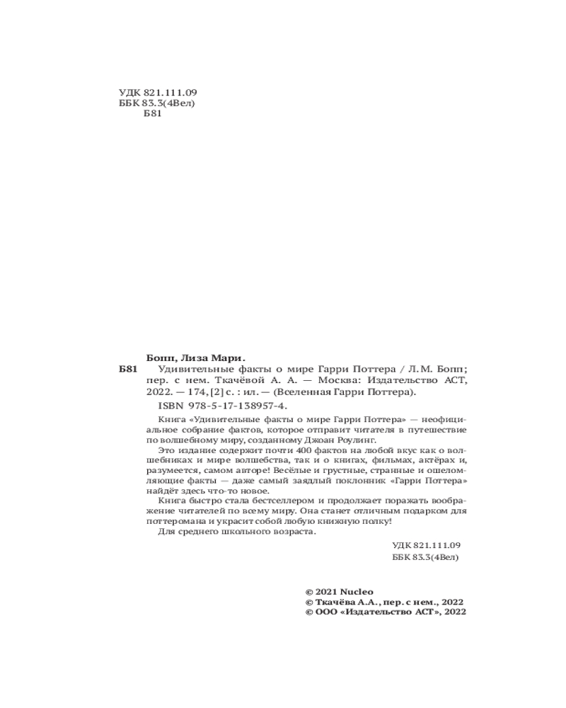 Серия: Вселенная Гарри Поттера Книга «Удивительные факты о мире Гарри Поттера» — неофициальное собрание фактов, которое отправит читателя в путешествие по волшебному миру, созданному Джоан Роулинг.