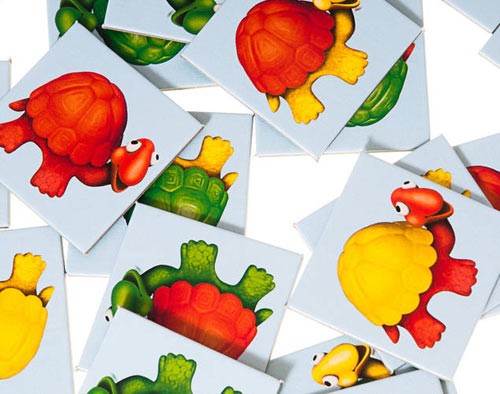 Хорошая игра для деток от 2 лет. В наборе 3 небольшие черепашки со съемными панцирями трех цветов, и 27 маленьких карточек (из очень плотного картона). С малышами можно начинать играть не по правилам, а просто собирать черепашку по картинке, или искать нужную картинку к черепашке. Играть по правилам будет интересно лет до 5-6.