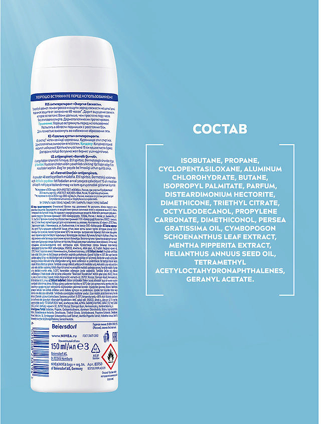 💳 Оплатить за товар можно при получении 🇰🇿 Есть бесплатная доставка по Казахстану от 1 дня 🎁 Копите бонусы с каждой покупки Серия: Энергия свежести Дезодорант-антиперспирант спрей для женщин Nivea «Энергия свежести» подарит Вам ощущение бодрящей свежести, которое Вы будете чувствовать весь день. Благодаря специальной формуле с экстрактом лемонграсса, антиперспирант эффективно контролирует уровень потоотделения в течение 48 часов. Антиперспирант быстро высыхает, не оставляя ощущения липкости на коже. Не оставляет следов на одежде. Уже более 100 лет Nivea создает особенно бережные для кожи формулы. Попробуй оптимальную комбинацию надежной защиты от пота и запаха и бережной заботы о коже от Nivea. Без этилового спирта в составе. |