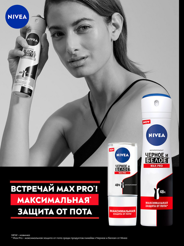 NIVEA Дезодорант-антиперспирант «Max Pro»В данный момент этот товар отсутствует в продаже. Возможно, у нас найдется аналогичный или похожий товар здесь. Серия: Невидимый для черного и белого Nivea представляет вам самого мощного помощника в борьбе с потом и неприятным запахом, который пройдет с вами любые испытания, будь то интенсивные занятия спортом, стресс на работе или просто активный образ жизни, ведь так важно быть уверенной в себе в любой момент дня, вне зависимости от обстоятельств. Антиперспирант Nivea «Черное и белое Max Pro» спрей обеспечивает максимальную* защиту от пота на протяжении 48 часов. Не оставляет белых следов на темной одежде и желтых пятен на белой. Вместе с MAX PRO ты можешь быть уверена в себе в течение всего дня! |