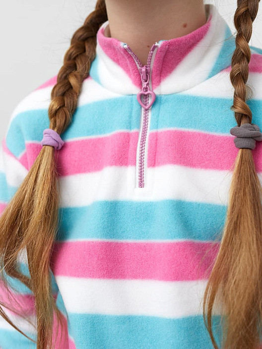 Мягкий тонкий флис, немного скрипучий, но может после стирки пройдет. На 116см взяла размер 122, село свободно, с небольшим запасом в рукавах. Большой минус-практически не тянется и слишком узкое горло, даже при полностью открытом замке голова влазиет с трудом. Такая же проблема у аналогичной модели серого цвета для мальчиков.