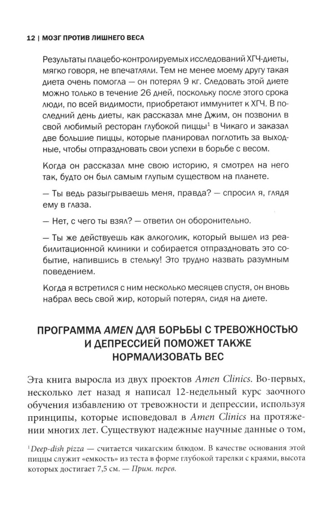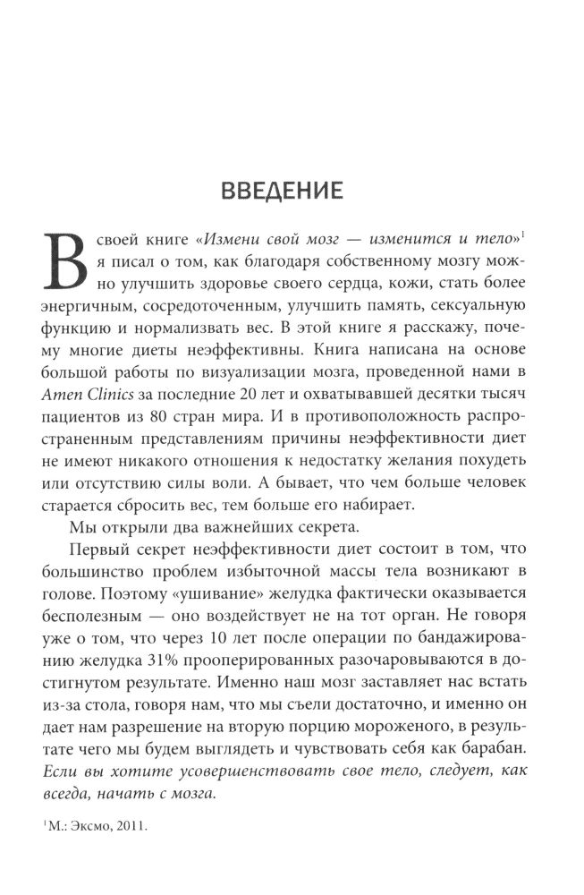 Мозг против лишнего весаВ данный момент этот товар отсутствует в продаже. Возможно, у нас найдется аналогичный или похожий товар здесь. Серия: Психология и мозг по Амену Почему многим никак не удается похудеть, а если и удается, то ненадолго? В чем причина — в недостатке силы воли, наследственности, неудачной диете? Известный нейрофизиолог и нейропсихиатр Дэниэл Амен утверждает: большинство проблем с лишним весом возникают не в желудке, а в мозге, поэтому начинать похудение нужно не с тела, а с «головы». В новой книге доктора Амена приводятся результаты новейших научных исследований, полученных с помощью компьютерного сканирования мозга. Согласно этим данным, существует пять типов мозга, связанных с избыточным весом. И ключ к успешному похудению — индивидуальный подход в зависимости от вашего типа. Программа похудения Амена — это не диета, а комплексный, безопасный для здоровья подход к борьбе с лишним весом, разработанный ученым и врачом с мировым именем. Эта книга поможет вам определить свой тип мозга и понять, как лучше худеть именно вам; навсегда забыть о переедании «для развлечения» и «на нервной почве»; внести в свою жизнь небольшие изменения, которые способствуют похудению; полюбить продукты, которые делают мозг здоровым, а тело стройным; избавиться от лишнего веса — без голодания и жестких тренировок. Навсегда. |