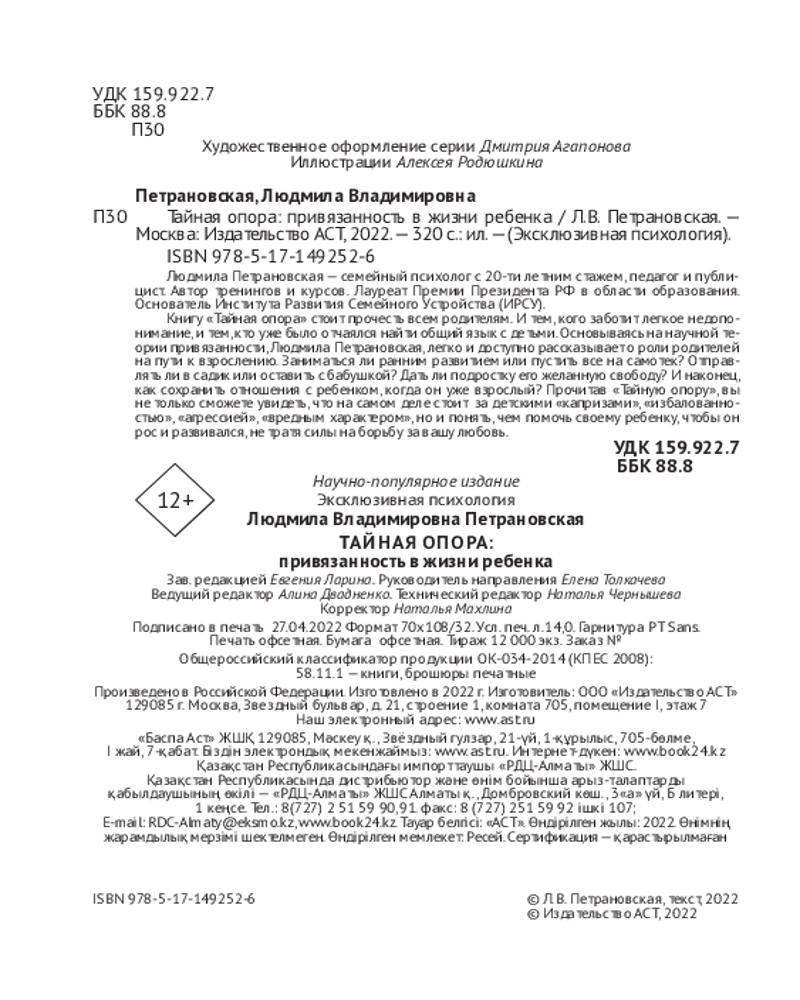 💳 Оплатить за товар можно при получении 🇰🇿 Есть бесплатная доставка по Казахстану 🎁 Копите бонусы с каждой покупки Серия: Эксклюзивная психология Абсолютный бестселлер от Людмилы Петрановской — автора, суммарный тираж вышедших книг которого превышает 1 000 000 экземпляров!Вместе с ребенком и его родителями вы пройдете путь от рождения до взрослости. Вы построите «дорожную карту» взросления и рассмотрите роль привязанности в этом процессе. Людмила Петрановская сосредоточивается на отношениях ребенка со «своими» взрослыми. Каждая глава книжки — это очередной этап детства. Каждый этап — это новые задачи возраста, новые потребности ребенка, новые возможности, но и новые риски, если потребности не будут удовлетворены. Книга позволит вам понять логику: как зависимость и беспомощность превращаются в зрелость, как наши любовь и забота год за годом формируют в ребенке тайную опору, на которой, как на стержне, держится его личность. |