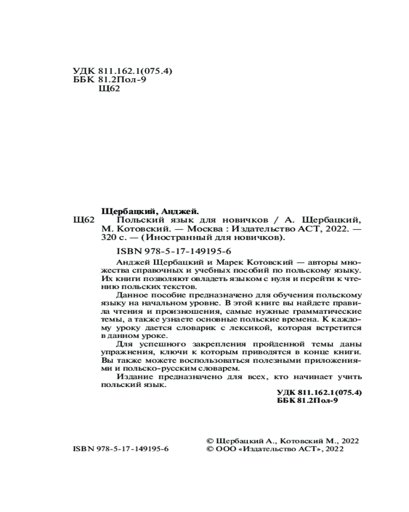 В данный момент этот товар отсутствует в продаже. Возможно, у нас найдется аналогичный или похожий товар здесь. Серия: Иностранный для новичков Анджей Щербацкий и Марек Котовский — авторы множества справочных и учебных пособий по польскому языку. Их книги позволяют овладеть языком с нуля и перейти к чтению польских текстов.