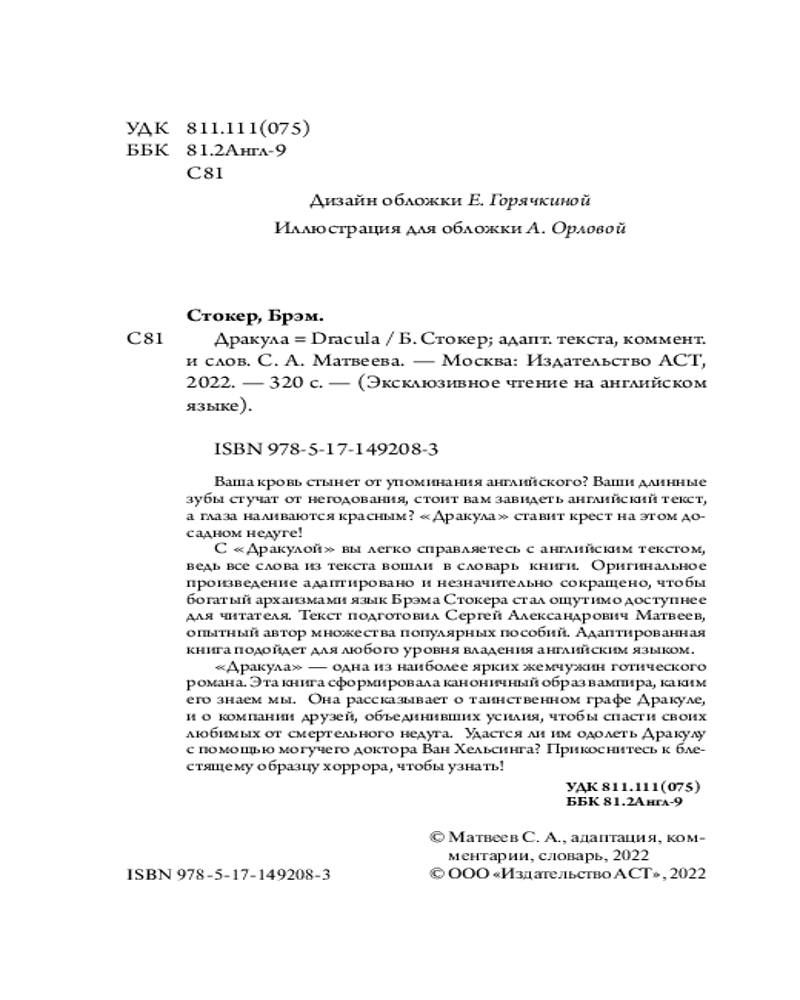 💳 Оплатить за товар можно при получении 🇰🇿 Есть бесплатная доставка по Казахстану от 1 дня 🎁 Копите бонусы с каждой покупки Серия: Эксклюзивное чтение на английском языке Ваша кровь стынет от упоминания английского? Ваши длинные зубы стучат от негодования, стоит вам завидеть английский текст, а глаза наливаются красным? «Дракула» ставит крест на этом досадном недуге! |
