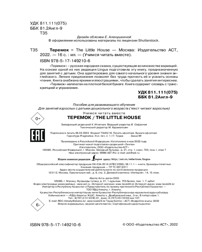 💳 Оплатить за товар можно при получении 🇰🇿 Есть бесплатная доставка по Казахстану 🎁 Копите бонусы с каждой покупки Серия: Учимся читать вместе «Теремок» — русская народная сказка, существующая во множестве вариаций. На основе одной из них редакция Lingua подготовила эту книгу, предназначенную для занятий с детьми. Она адаптирована для самого начального уровня знания английского. Легкие предложения позволят без труда прочесть её и усвоить основы чтения. Книга снабжена яркими иллюстрациями, чтобы сделать занятия интереснее. |