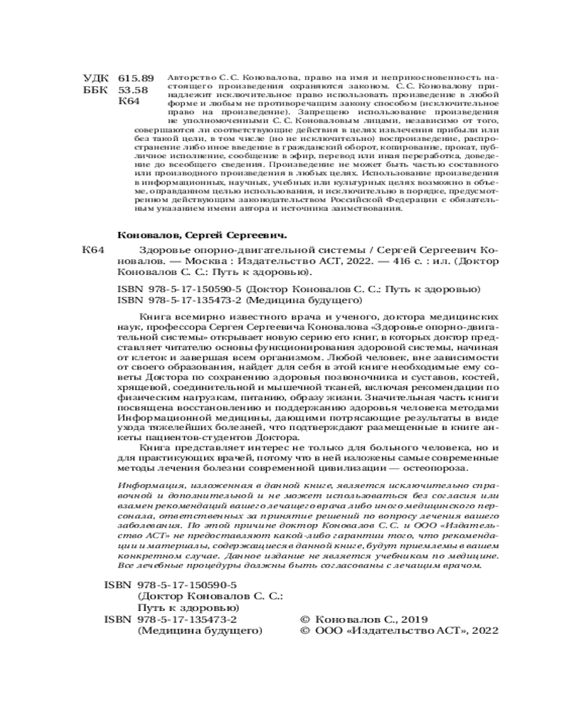 💳 Оплатить за товар можно при получении 🇰🇿 Есть бесплатная доставка по Казахстану от 1 дня 🎁 Копите бонусы с каждой покупки Серия: Доктор Коновалов С.С.: Путь к здоровью Книга «Здоровье опорно-двигательной системы» открывает новую серию книг Сергея Коновалова, в которых нет привычных для нас названий болезней, диагнозов, симптомов, причин их развития. Доктор раскрывает перед читателями функцию здоровой системы, начиная от клеток и завершая всем организмом. Любой человек, вне зависимости от своего образования, найдет для себя в этой книге необходимые ему советы Доктора. Результаты выздоровления, которыми вряд ли может поделиться любая медицинская клиника планеты, не просто удивительные — они фантастические! |