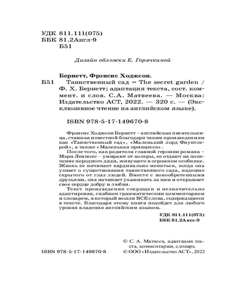 💳 Оплатить за товар можно при получении 🇰🇿 Есть бесплатная доставка по Казахстану от 1 дня 🎁 Копите бонусы с каждой покупки Серия: Эксклюзивное чтение на английском языке Фрэнсис Ходжсон Бёрнетт — английская писательница, ставшая известной благодаря таким произведениям как «Таинственный сад», «Маленький лорд Фаунтлерой», а также «Маленькая принцесса». |