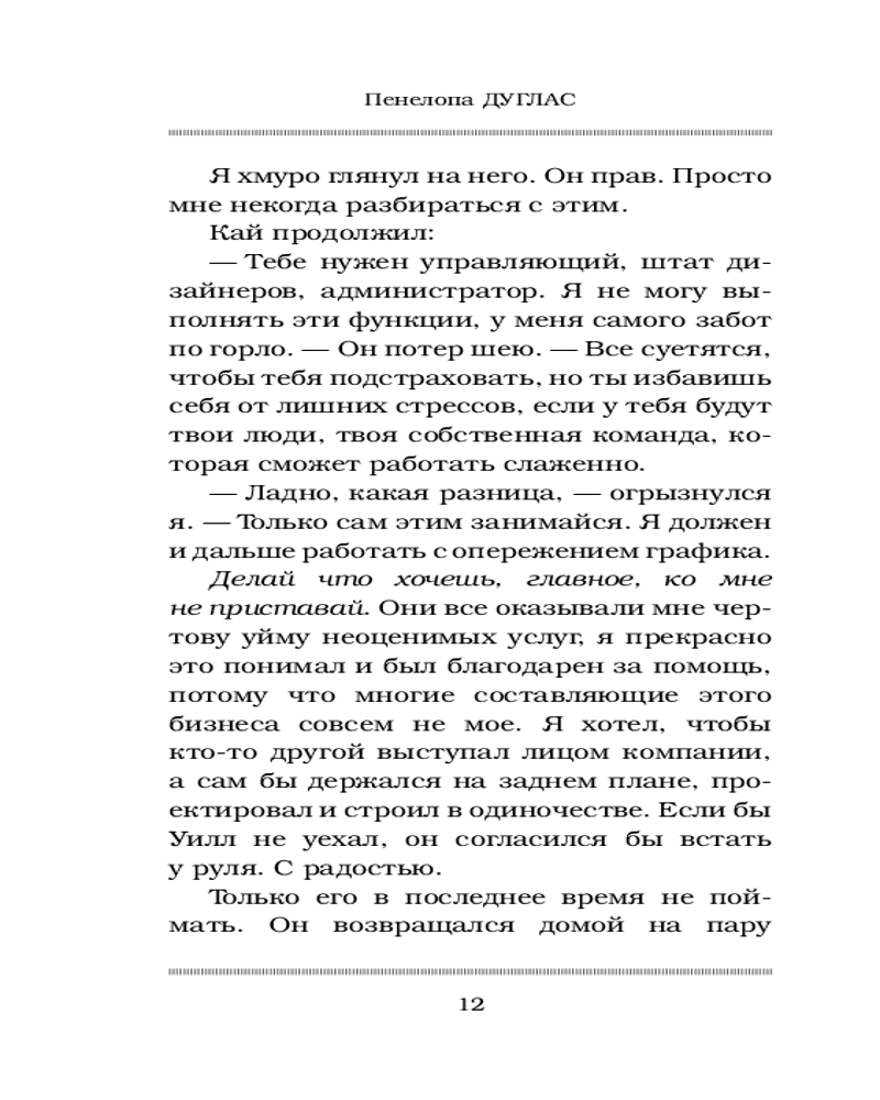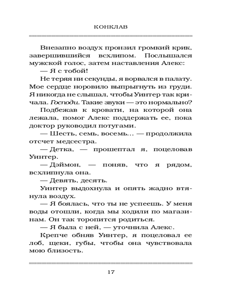 Внимание, спойлер. Скучная, маленькая и дорогая. Не стоящая внимания. Ненужная. Выглядит, как нарост среди предыдущих томов. Много информации она не дает. Достаточно ее описать несколькими предложениями. Спойлер: Спустя год, после «Курка»: Рика не может иметь детей, но по ходу сможет с конце всей серии Ночи Дьявола, свадьба через месяц. Они ищут Уилла. Уинтер беременна вторым ребенком. К ним присоединились герои из «Панк 57». Чтоб прочесть книгу хватит 1-2 часа. Можно было ее добавить в книгу про Деймона. Но капиталисты решили иначе, и вот перед нами «Конклав». Скучно. И я удивлена. Почему же так уныло то написано. Нет драйва, встряски. Тайна Рики не прям такая суровая, да там сразу понятно что у нее проблемы с детородными органами, никакой интриги Пенелопа Дуглас не умеет держать. Эта книга для тех, кто хочет коллекционировать цикл Ночь Дьявола.