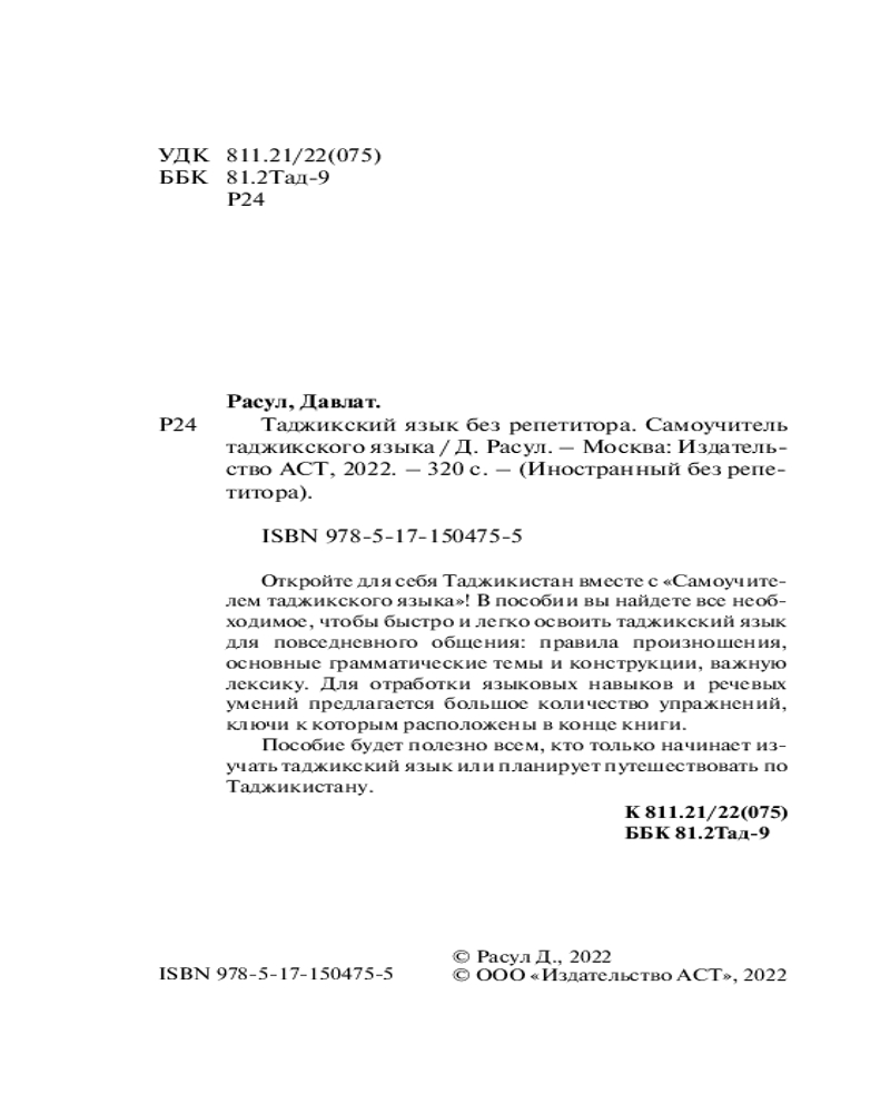 💳 Оплатить за товар можно при получении 🇰🇿 Есть бесплатная доставка по Казахстану от 1 дня 🎁 Копите бонусы с каждой покупки Серия: Иностранный без репетитора Величественные горы, уникальные озера, древняя архитектура — откройте для себя Таджикистан вместе с «Самоучителем таджикского языка»! В пособии вы найдете все необходимое, чтобы быстро и легко освоить таджикский язык для повседневного общения: правила произношения, основные грамматические темы и конструкции, важную лексику. Для отработки языковых навыков и речевых умений предлагается большое количество упражнений, ключи к которым расположены в конце книги. Пособие будет полезно всем, кто только начинает изучать таджикский язык или планирует путешествовать по Таджикистану. |
