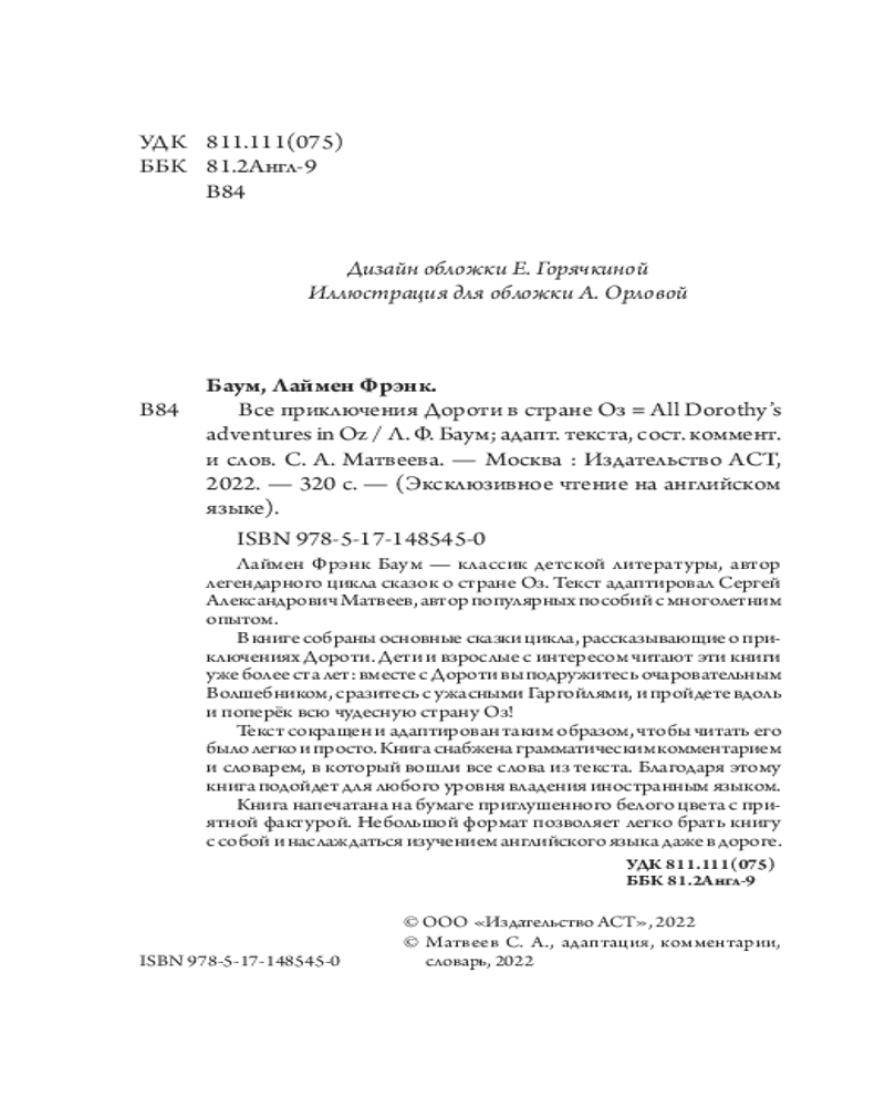 💳 Оплатить за товар можно при получении 🇰🇿 Есть бесплатная доставка по Казахстану от 1 дня 🎁 Копите бонусы с каждой покупки Серия: Эксклюзивное чтение на английском языке Лаймен Фрэнк Баум — классик детской литературы, автор легендарного цикла сказок о стране Оз. Текст адаптировал Сергей Александрович Матвеев, автор популярных пособий с многолетним опытом. |