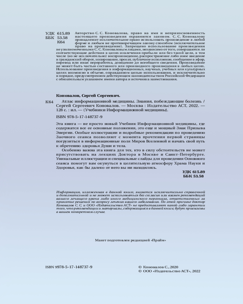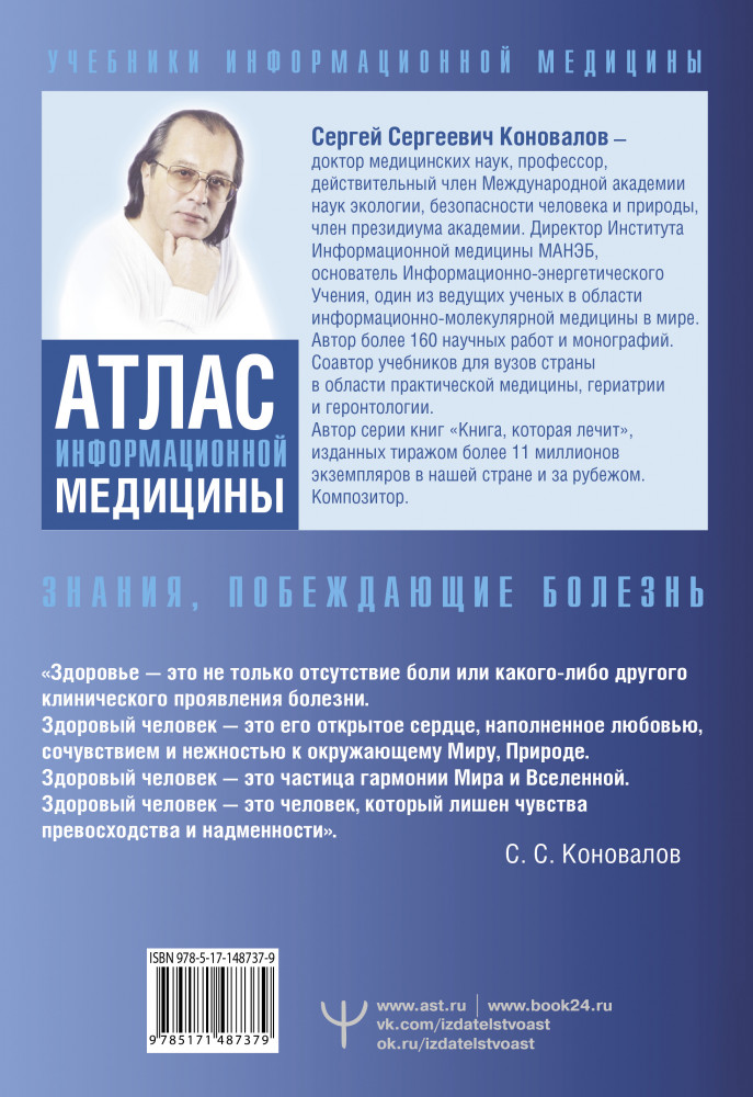 💳 Оплатить за товар можно при получении 🇰🇿 Есть бесплатная доставка по Казахстану от 1 дня 🎁 Копите бонусы с каждой покупки Серия: Учебники Информационной Медицины В этой книге всемирно известный врач и ученый, доктор медицинских наук, профессор Сергей Сергеевич Коновалов излагает основные положения Информационно-энергетического Учения и дает подробные рекомендации по проведению заочного сеанса. Эта книга — уникальный Учебник Информационной медицины, где содержатся самые важные сведения, которые необходимы пациенту-студенту Доктора. Но не только! Иллюстрации на страницах книги и специальные слайды предназначены для проведения Основного сеанса и максимально полного погружения в Информационные Поля Энергии Сотворения. |