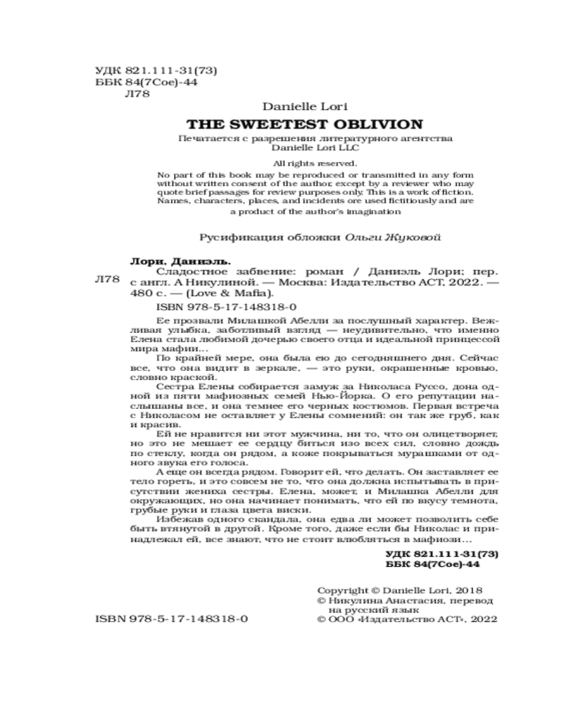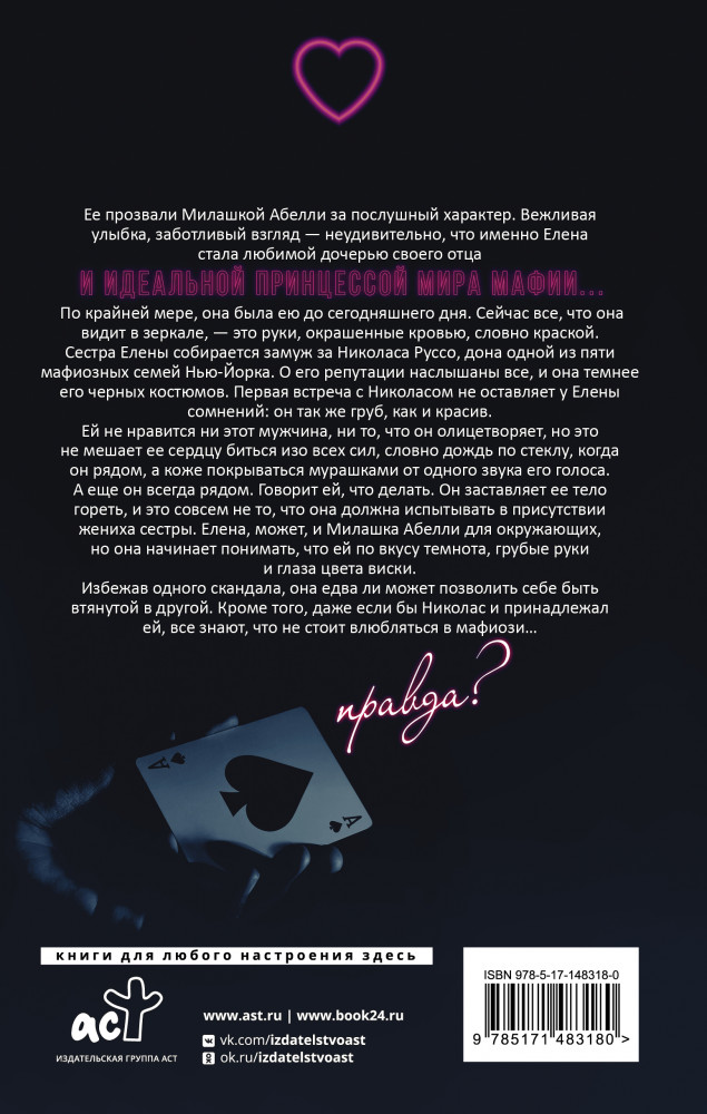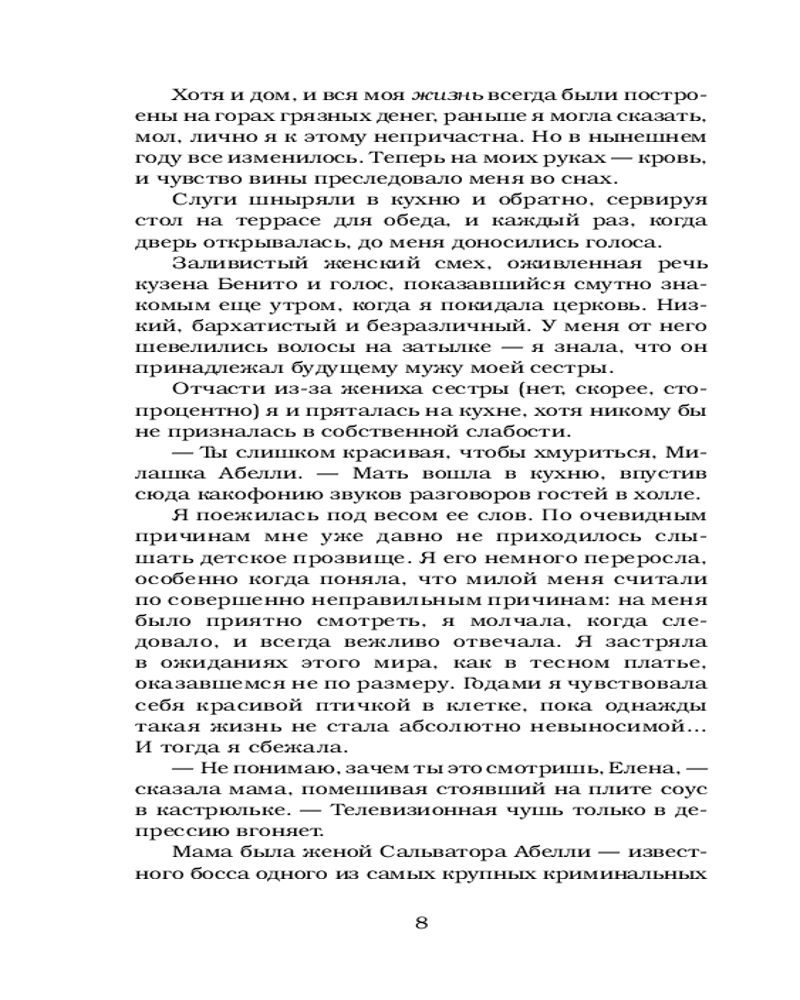 Серия: Love & Mafia Ее прозвали Милашкой Абелли за послушный характер. Вежливая улыбка, заботливый взгляд — неудивительно, что именно Елена стала любимой дочерью своего отца и идеальной прицессой мира мафии... По крайней мере, она была ею до сегодняшнего дня. Сейчас все, что она видит в зеркале, — это руки, окрашенные кровью, словно краской.
