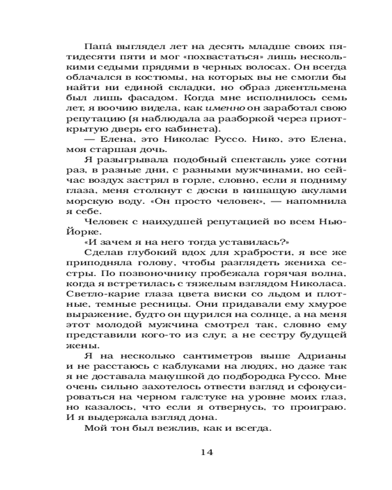 Сестра Елены собирается замуж за Николаса Руссо, дона одной из пяти мафиозных семей Нью-Йорка. О его репутации наслышаны все, и она темнее его черных костюмов. Первая встреча с Николасом не оставляет у Елены сомнений: он так же груб, как и красив.