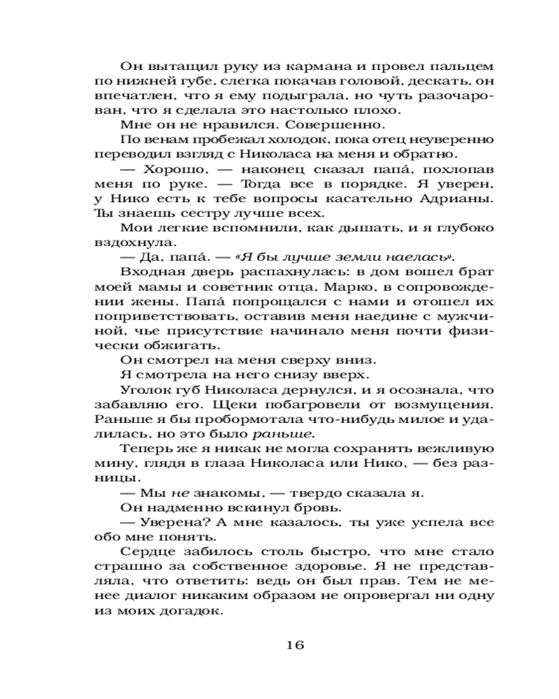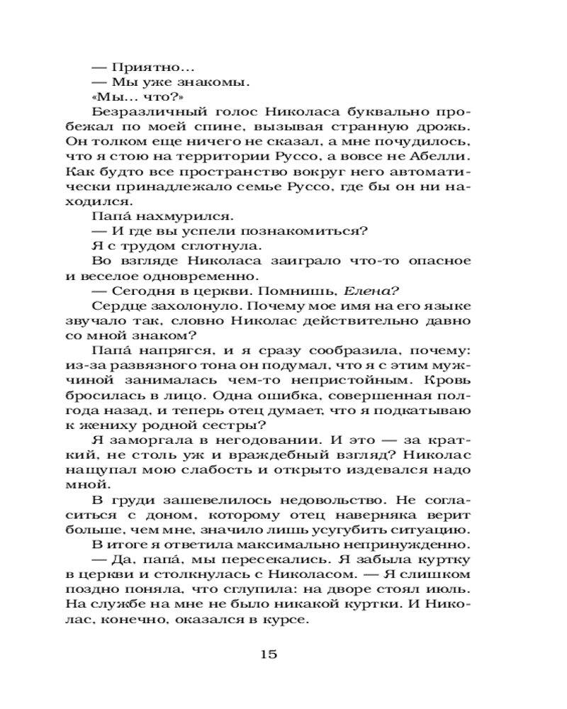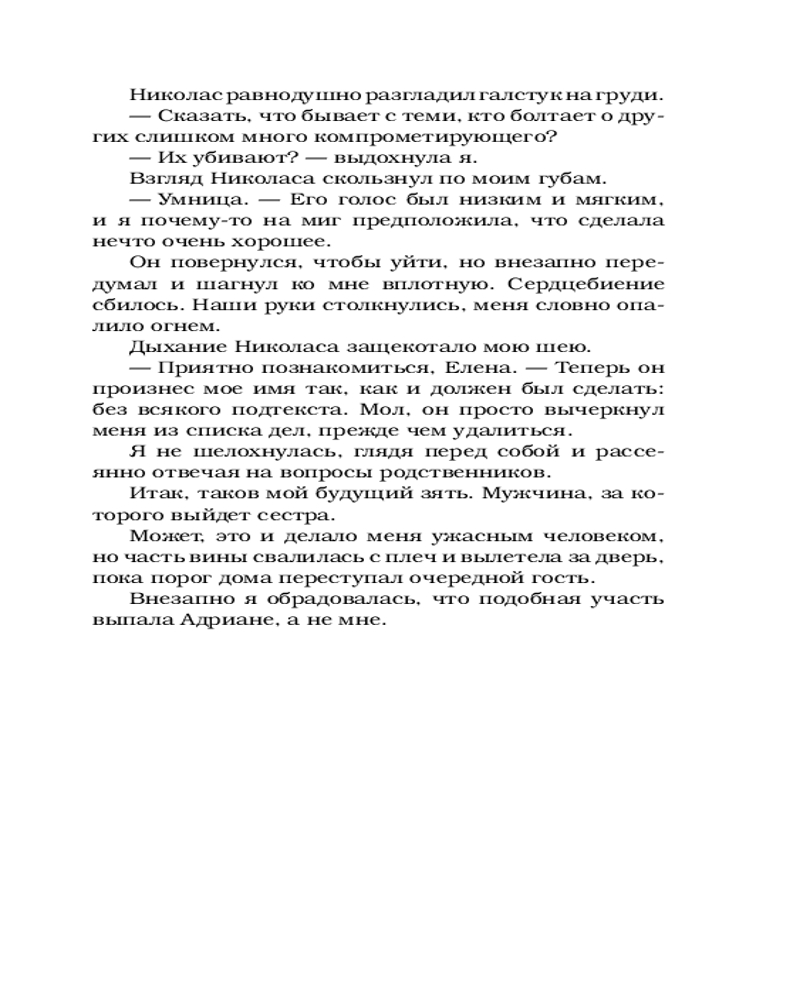 Ей не нравится ни этот мужчина, ни то, что он олицетворяет, но это не мешает ее сердцу биться изо всех сил, словно дождь по стеклу, когда он рядом, а коже покрываться мурашками от одного звука его голоса. А еще он всегда рядом. Говорит ей, что делать. Он заставляет ее тело гореть, и это совсем не то, что она должна испытывать в присутствии жениха сестры. Елена, может, и Милашка Абелли для окружающих, но она начинает понимать, что ей по вкусу темнота, грубые руки и глаза цвета виски.