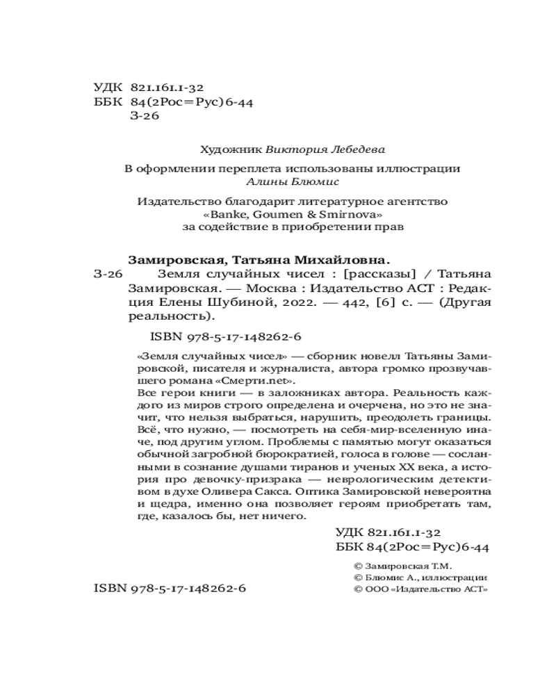 💳 Оплатить за товар можно при получении 🇰🇿 Есть бесплатная доставка по Казахстану от 1 дня 🎁 Копите бонусы с каждой покупки Серия: Другая реальность «Земля случайных чисел» — сборник новелл Татьяны Замировской, писателя и журналиста, автора громко прозвучавшего романа «Смерти.net». |