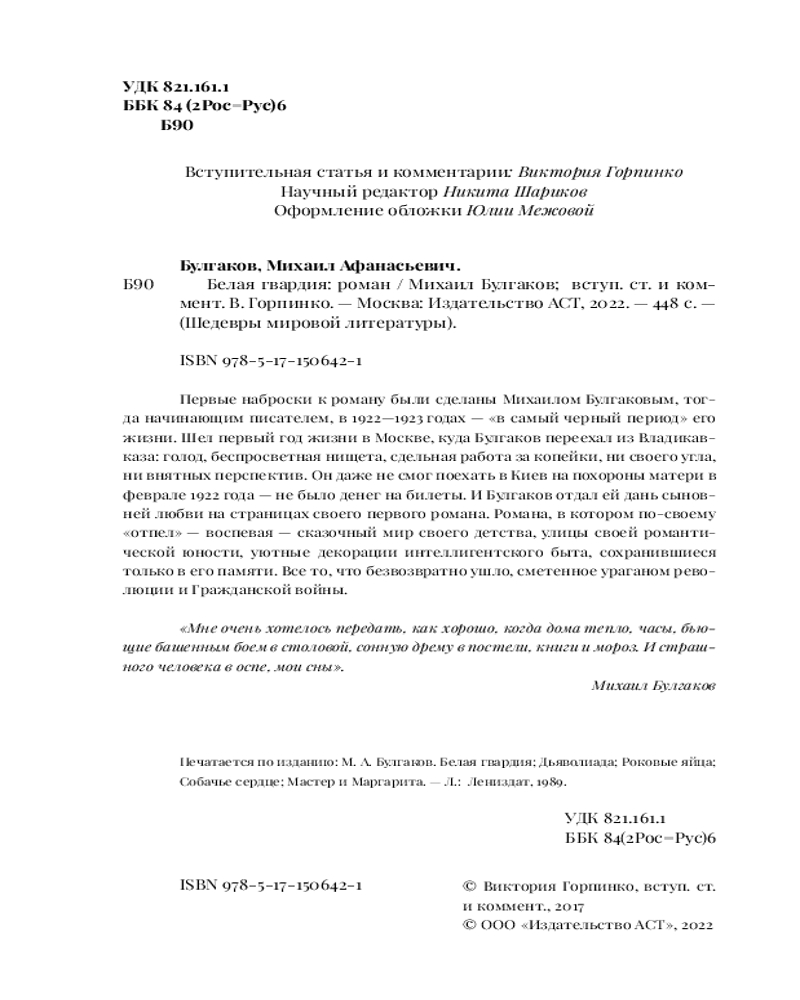 Белая гвардияВ данный момент этот товар отсутствует в продаже. Возможно, у нас найдется аналогичный или похожий товар здесь. Серия: Шедевры мировой литературы Михаил Булгаков — великий русский писатель XX столетия. А роман «Белая гвардия» — его самый первый роман, описывающий трагедию 1918 года: ужасающую гражданскую войну и разрушение мира русской интеллигенции. Роман отлично подойдет всем, интересующимся историей, так как описываемые события — вполне реальны, а все персонажи имеют свои прототипы, от чего сюжет становится еще более интригующим. |