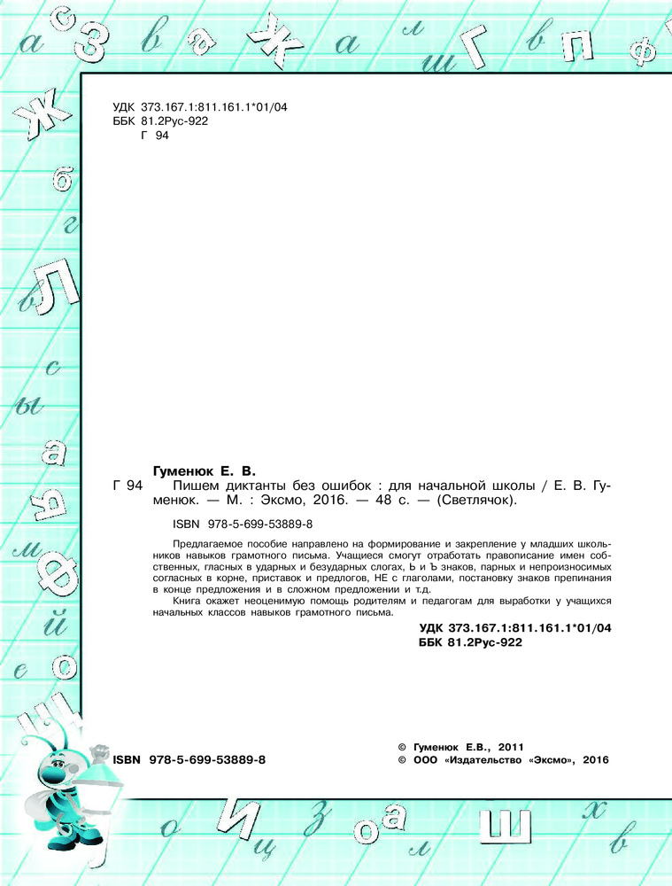 В данный момент этот товар отсутствует в продаже. Возможно, у нас найдется аналогичный или похожий товар здесь. Серия: Светлячок Предлагаемое пособие направлено на формирование и закрепление у младших школьников навыков грамотного письма. Учащиеся смогут отработать правописание имен собственных, гласных в ударных и безударных слогах, Ь и Ъ знаков, парных и непроизносимых согласных в корне, приставок и предлогов, НЕ с глаголами, постановку знаков препинания в конце предложения и в сложном предложении и т. д. Книга окажет неоценимую помощь родителям и педагогам для выработки у учащихся начальных классов навыков грамотного письма. |