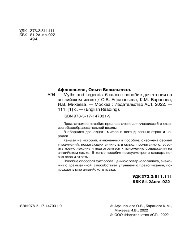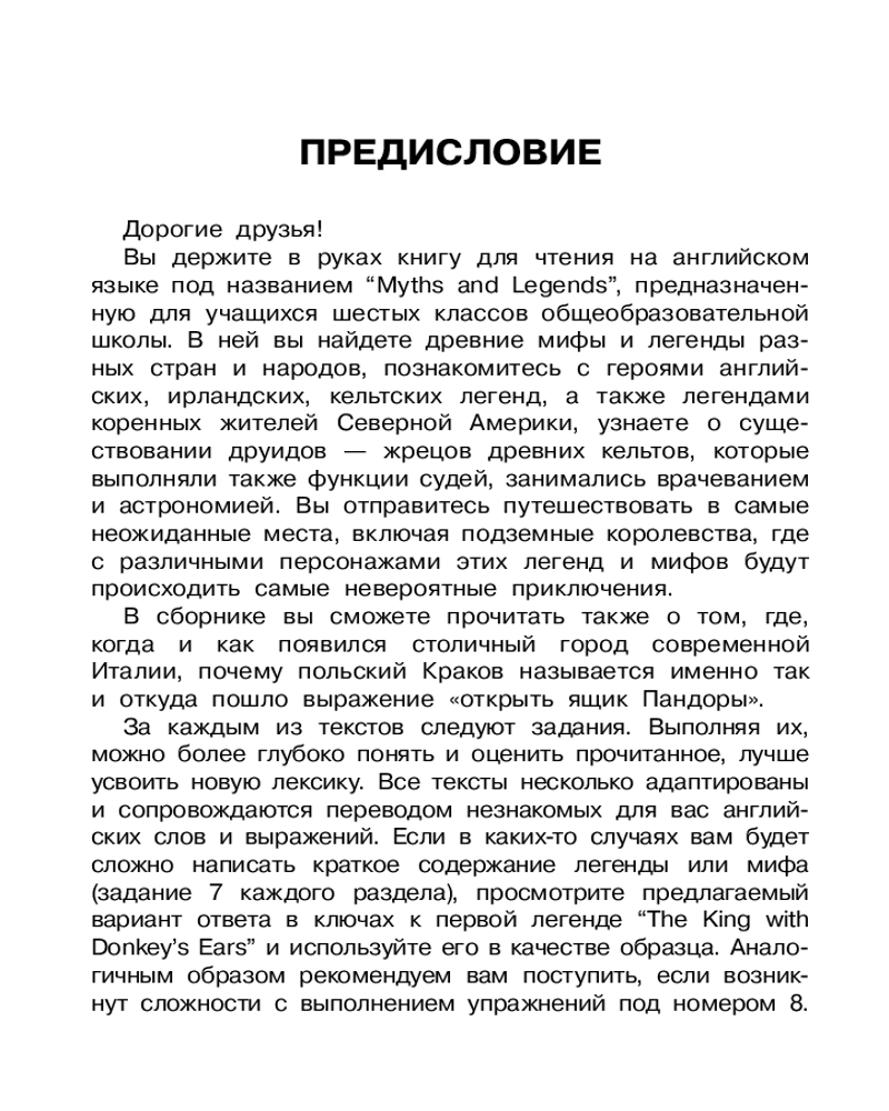 English Reading. Myths and legends. 6 classИрина Владимировна Михеева, Ольга Васильевна Афанасьева, Ксения Михайловна Баранова В данный момент этот товар отсутствует в продаже. Возможно, у нас найдется аналогичный или похожий товар здесь. Серия: Читаем по-английски Предлагаемое пособие предназначено для учащихся 6-х классов общеобразовательной школы.В сборнике двенадцать мифов и легенд разных стран и народов. Каждая из историй, включенных в пособие, снабжена серией упражнений, помогающих вникнуть в смысл прочитанного, усвоить новую лексику и подготовиться к изложению содержания на английском языке. В конце пособия предусмотрены словарь новых слов и ответы.Пособие способствует обогащению словарного запаса, знакомит с грамматикой, способствует улучшению правописания, погружает в мир английского языка. |