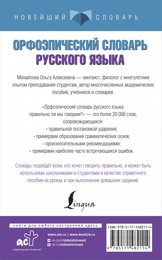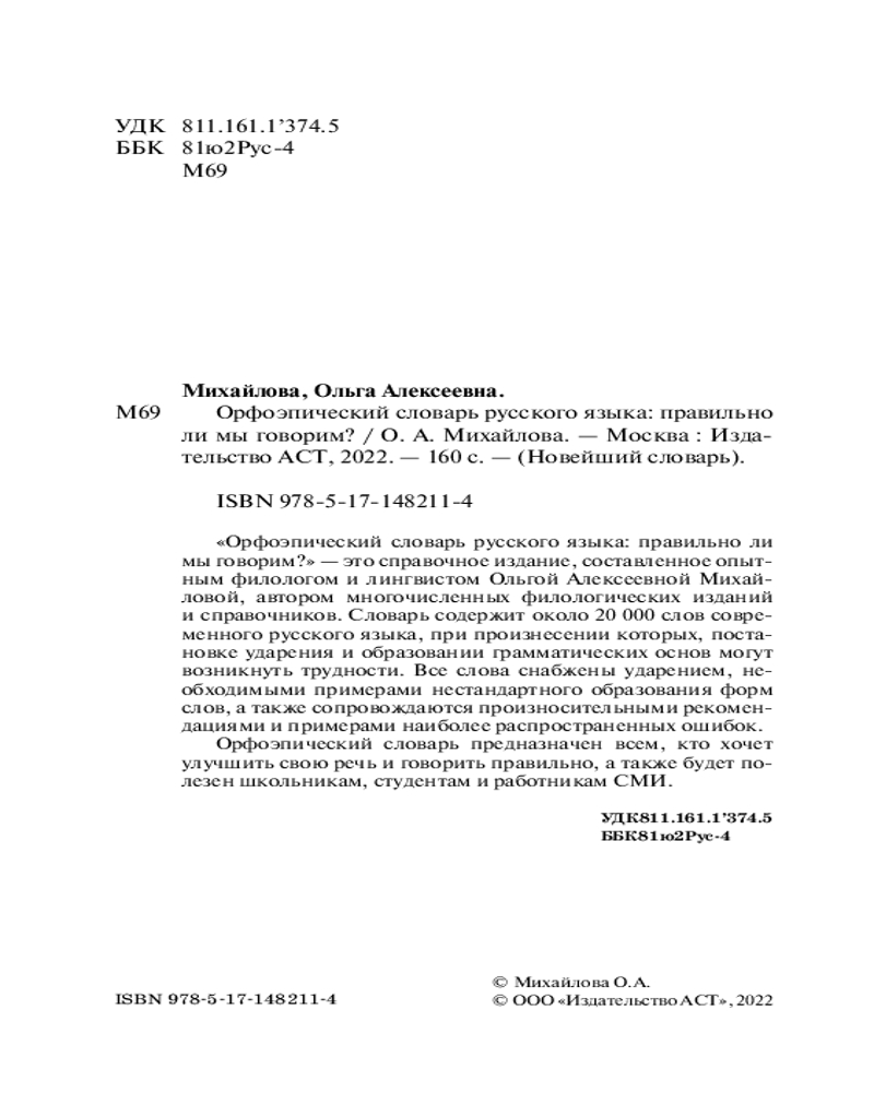 Орфоэпический словарь русского языка: правильно ли мы говорим?В данный момент этот товар отсутствует в продаже. Возможно, у нас найдется аналогичный или похожий товар здесь. Серия: Новейший словарь «Орфоэпический словарь русского языка: правильно ли мы говорим?» — это справочное издание, составленное опытным филологом и лингвистом Ольгой Алексеевной Михайловой, автором многочисленных филологических изданий и справочников. Словарь содержит около 20 000 слов современного русского языка, при произнесении которых, постановке ударения и образовании грамматических основ могут возникнуть трудности. Все слова снабжены ударением, необходимыми примерами нестандартного образования форм слов, а также сопровождаются произносительными рекомендациями и примерами наиболее распространенных ошибок. |