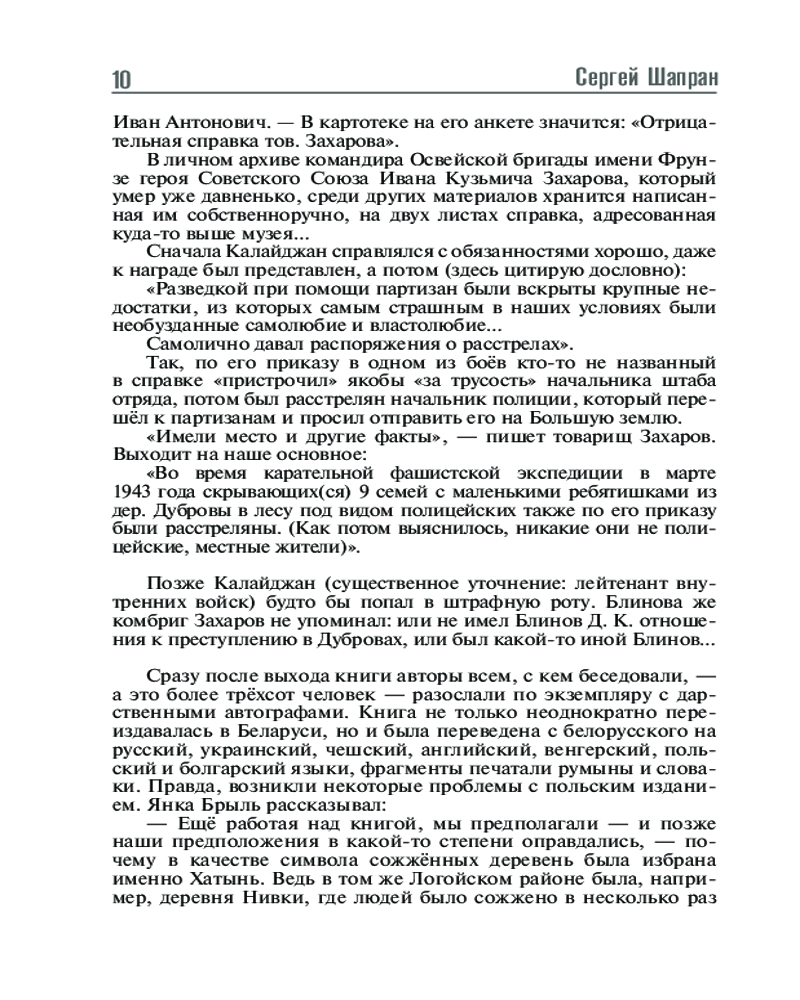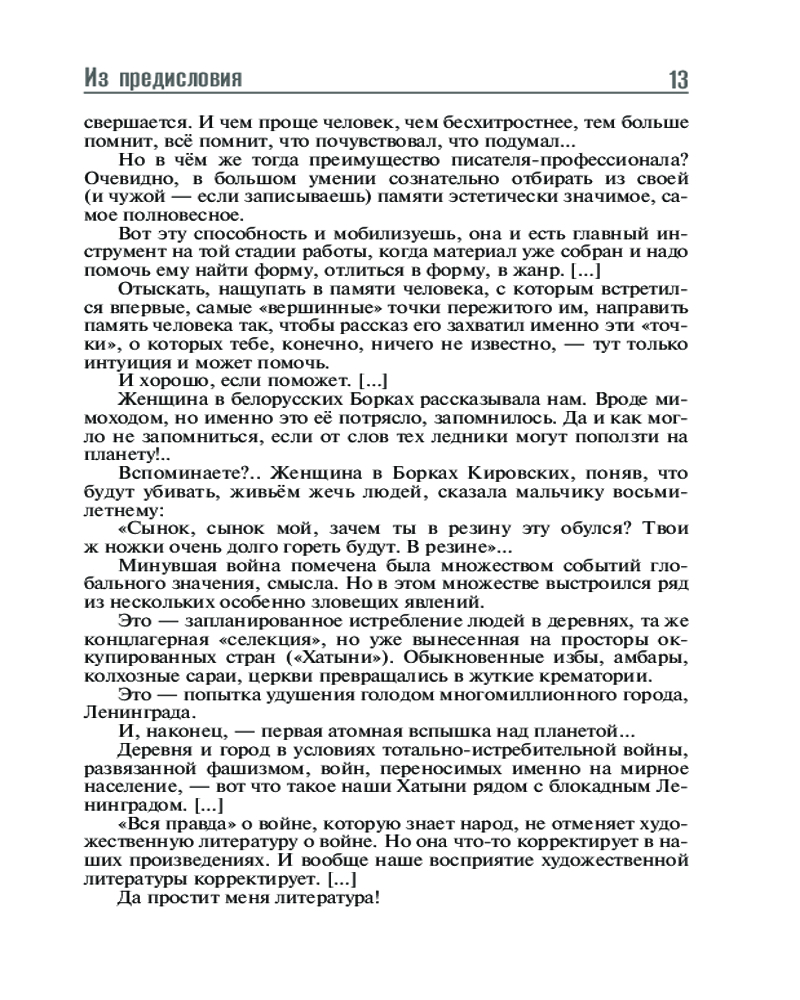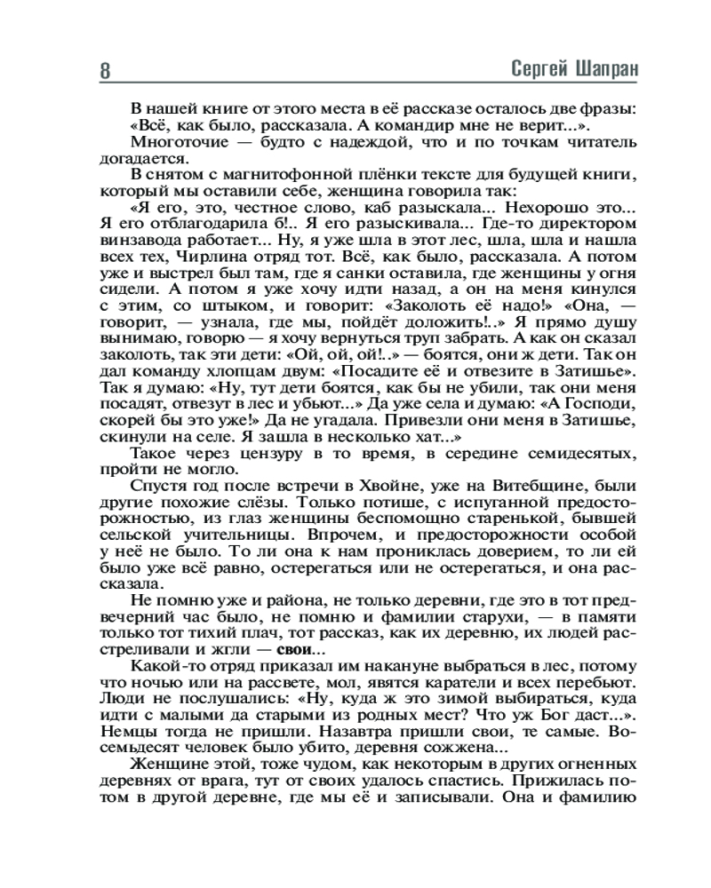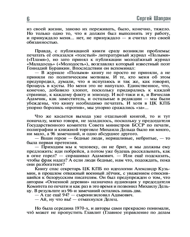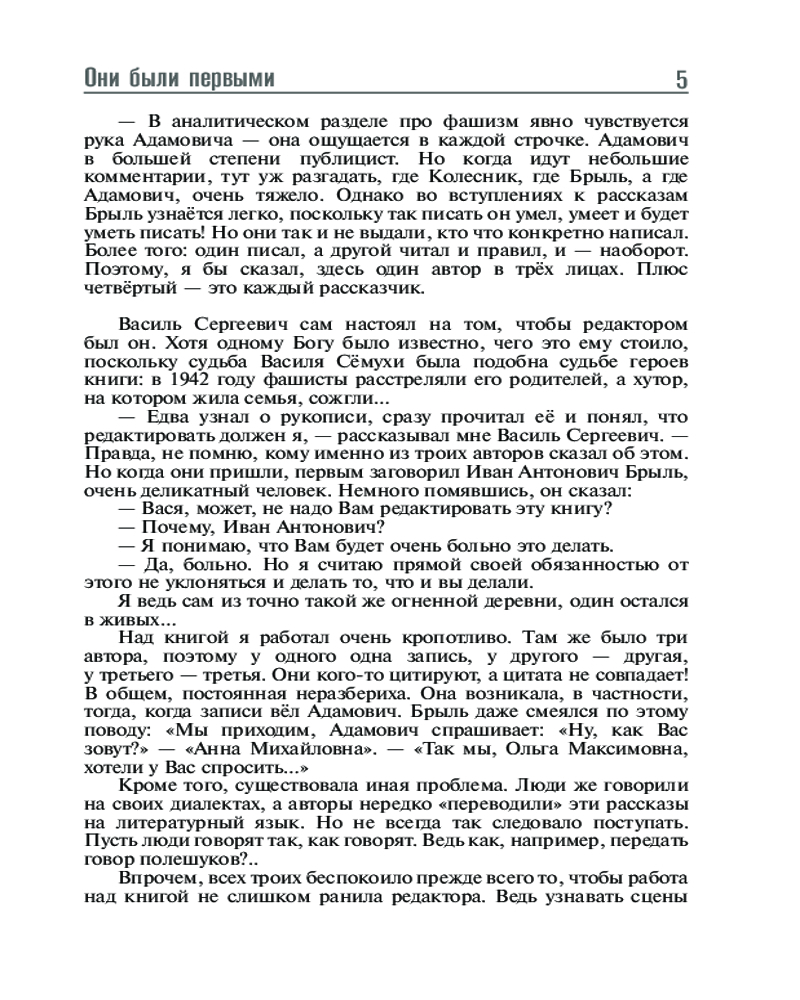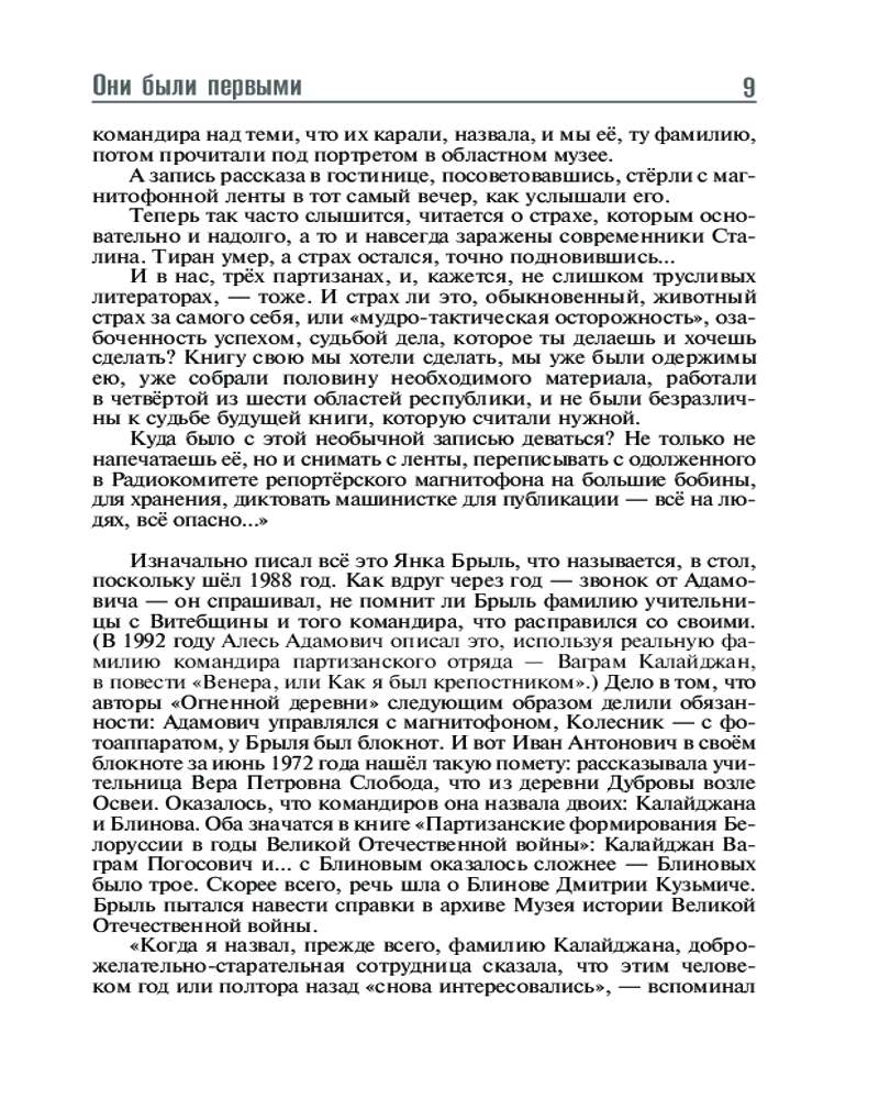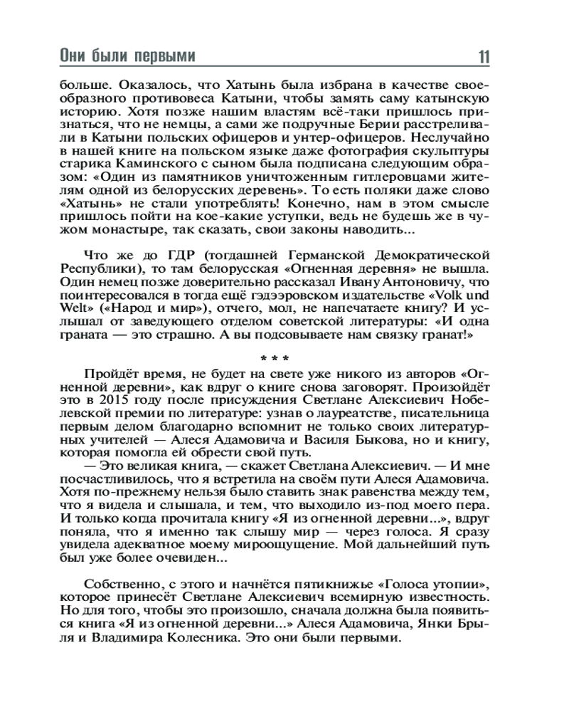 Книга «Я из огненной деревни» имеет огромное значение для всех, кто участвовал в ее создании, — сразу после перовой публикации более 300 человек, принимавших участие в беседах, получили от авторов экземпляр с дарственными автографами. Эта книга — память и боль простых людей. Свидетельства спасшихся жителей сожженных деревень звучат откровением, и читатель отчетливо слышит их голоса.
