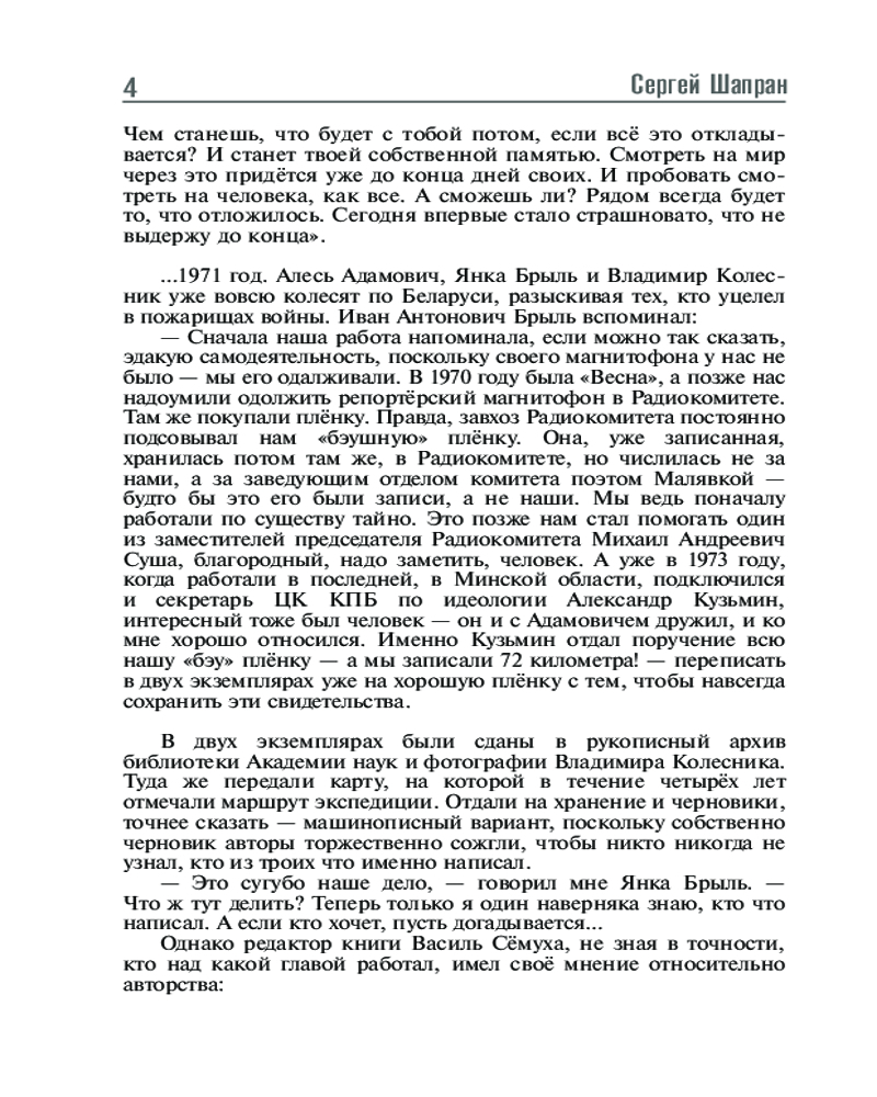 В книгу вошли свидетельства только тех людей, которые лично пережили трагедию сожженных деревень, убийства родных и односельчан. Для опроса очевидцев писатели на протяжении 1970-1973 годов объездили с магнитофоном 147 деревень в 35 районах Белоруссии и записали воспоминания более 300 непосредственных участников событий.
