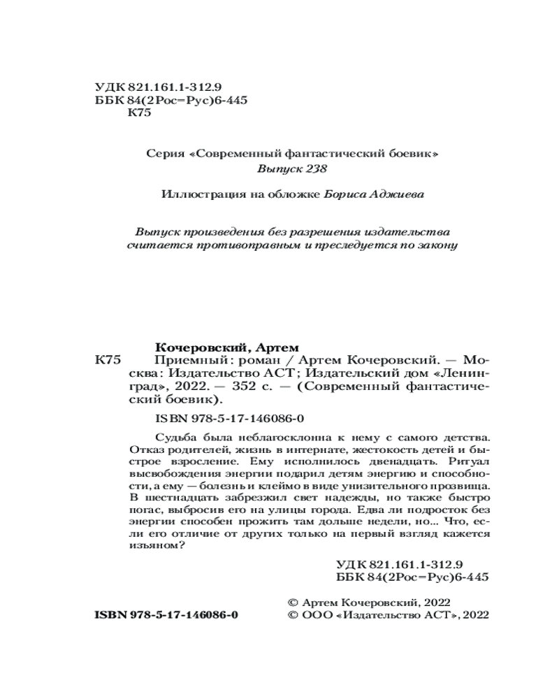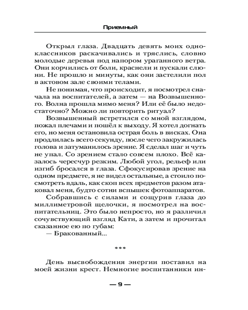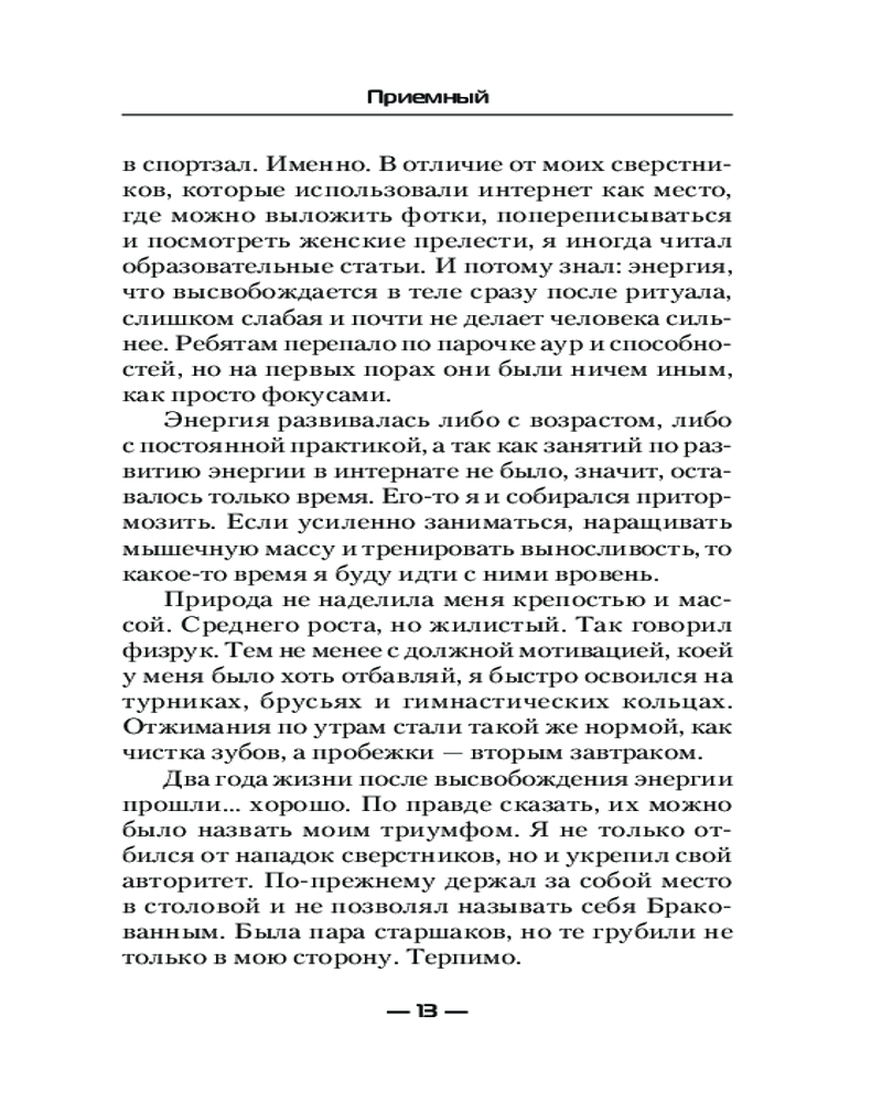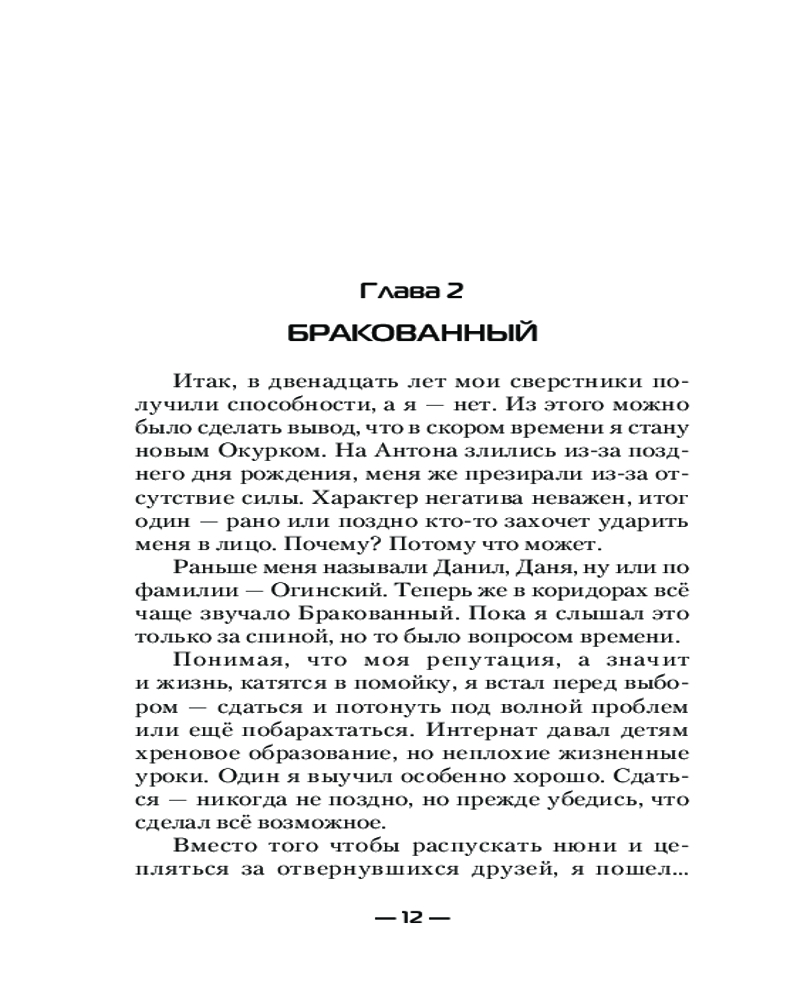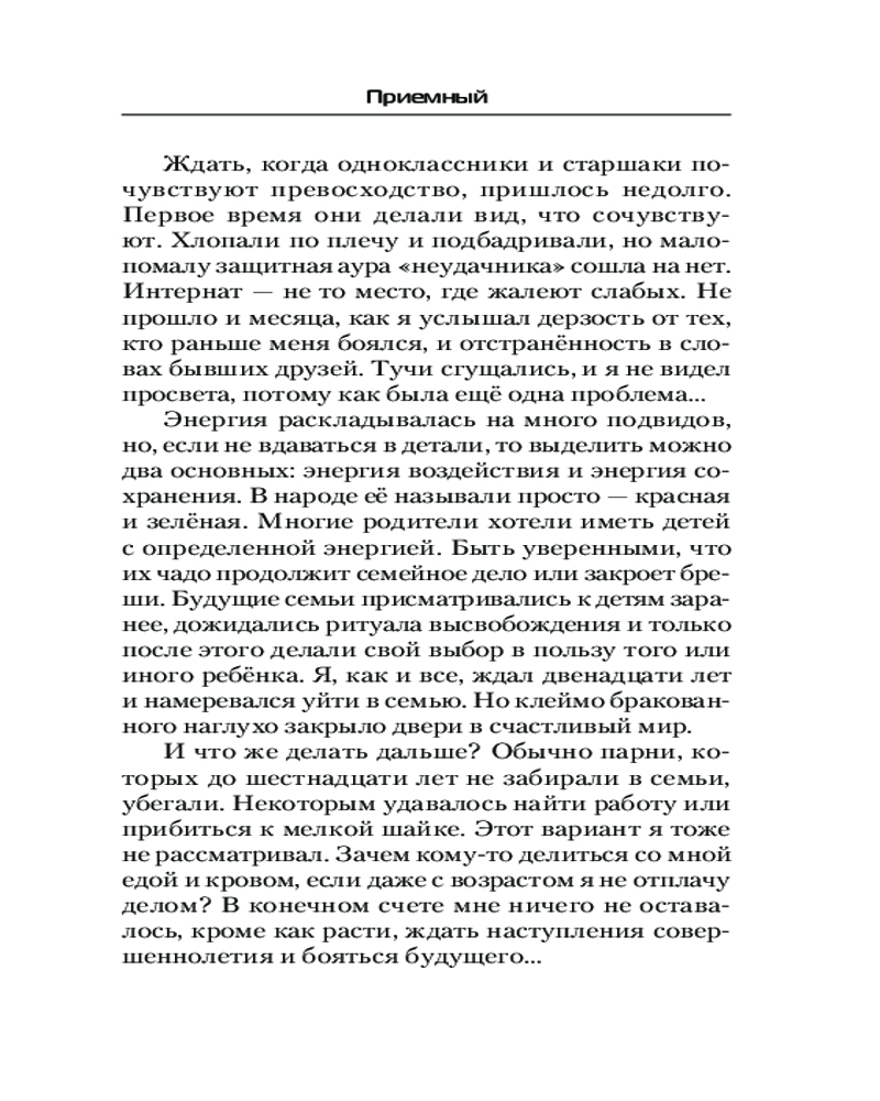 ПриемныйВ данный момент этот товар отсутствует в продаже. Возможно, у нас найдется аналогичный или похожий товар здесь. Серия: Современный фантастический боевик Судьба была неблагосклонна к нему с самого детства. Отказ родителей, жизнь в интернате, жестокость детей и быстрое взросление. Ему исполнилось двенадцать. Ритуал высвобождения энергии подарил детям энергию и способности, а ему — болезнь и клеймо в виде унизительного прозвища. |