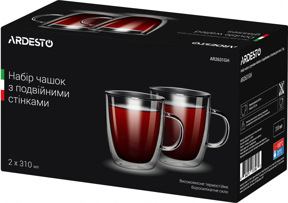 Ardesto Набор чашеккачество легкие удобные не нагреваются ручка В данный момент этот товар отсутствует в продаже. Возможно, у нас найдется аналогичный или похожий товар здесь. Набор чашек с двойными стенками. В набор входят две чашки объемом по 310 мл. Чашки изготовлены из термостойкого боросиликатного стекла. |