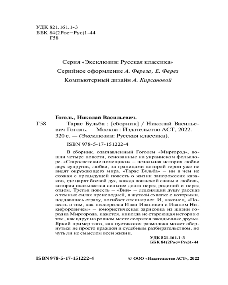 💳 Оплатить за товар можно при получении 🇰🇿 Есть бесплатная доставка по Казахстану от 1 дня 🎁 Копите бонусы с каждой покупки Серия: Эксклюзив: Русская классика В сборник, озаглавленный Гоголем «Миргород», вошли четыре повести, основанные на украинском фольклоре. «Старосветские помещики» — печальная история любви двух супругов, любви, за границами которой герои уже не видят окружающего мира. «Тарас Бульба» — ни в чем не схожая с предыдущей повесть о жизни запорожских казаков, где царят боевой дух, жажда воинской славы и любовь, которая оказывается сильнее долга перед родиной и перед отцом. Третья повесть — «Вий» — леденящий душу рассказ о темных силах преисподней, в жуткой схватке с которыми, поддавшись страху, погибает семинарист. И, наконец, «Повесть о том, как поссорился Иван Иванович с Иваном Никифоровичем» — юмористическая зарисовка из жизни городка Миргорода, кажется, никогда не стареющая история о том, как вдруг на ровном месте ссорятся закадычные друзья. Яркий пример того, как пустяковая размолвка может обернуться не просто враждой и судебным разбирательством, но чуть ли не смыслом всей жизни. |