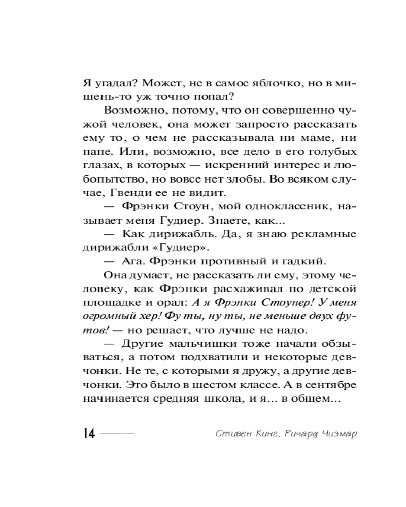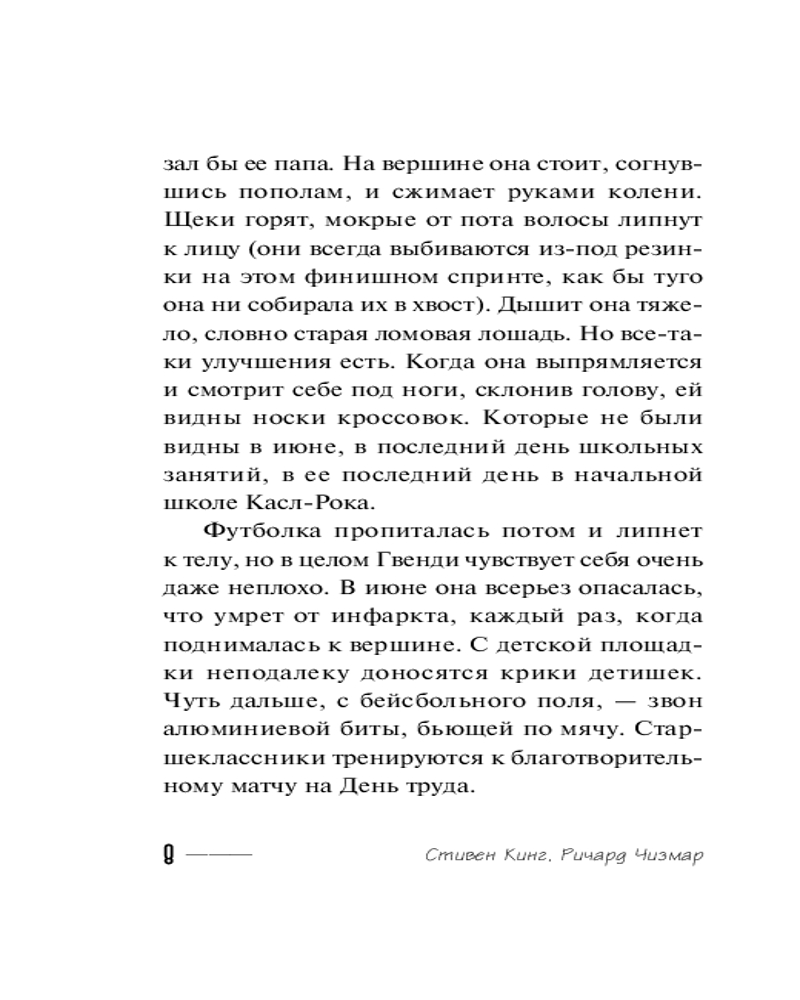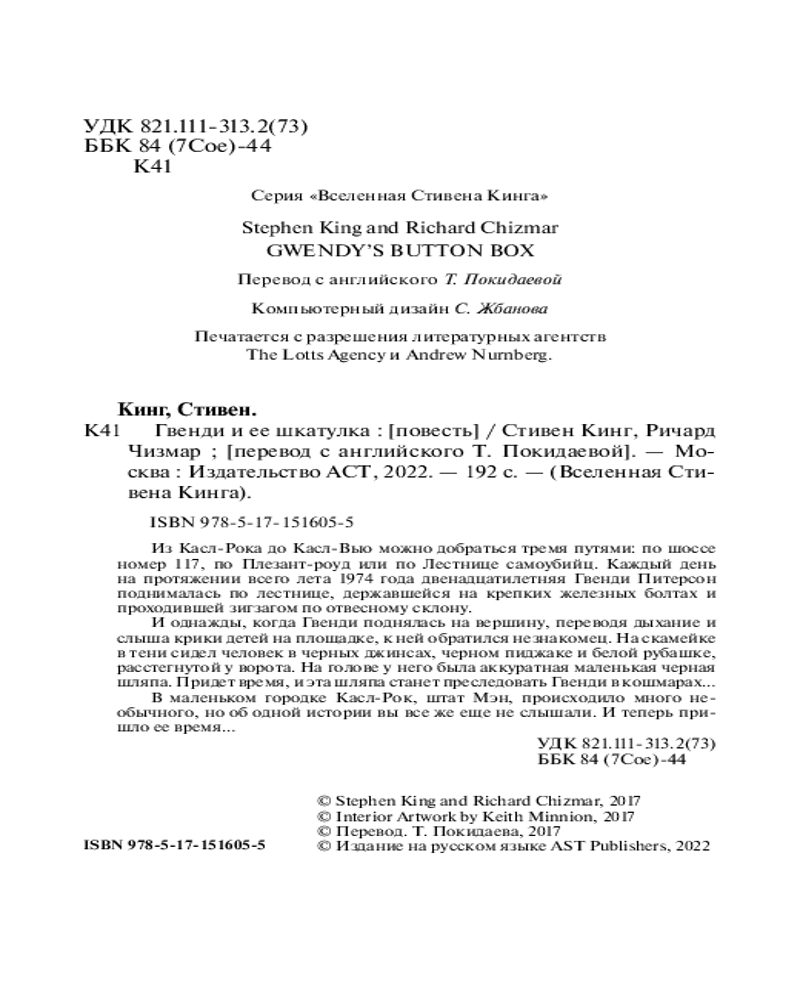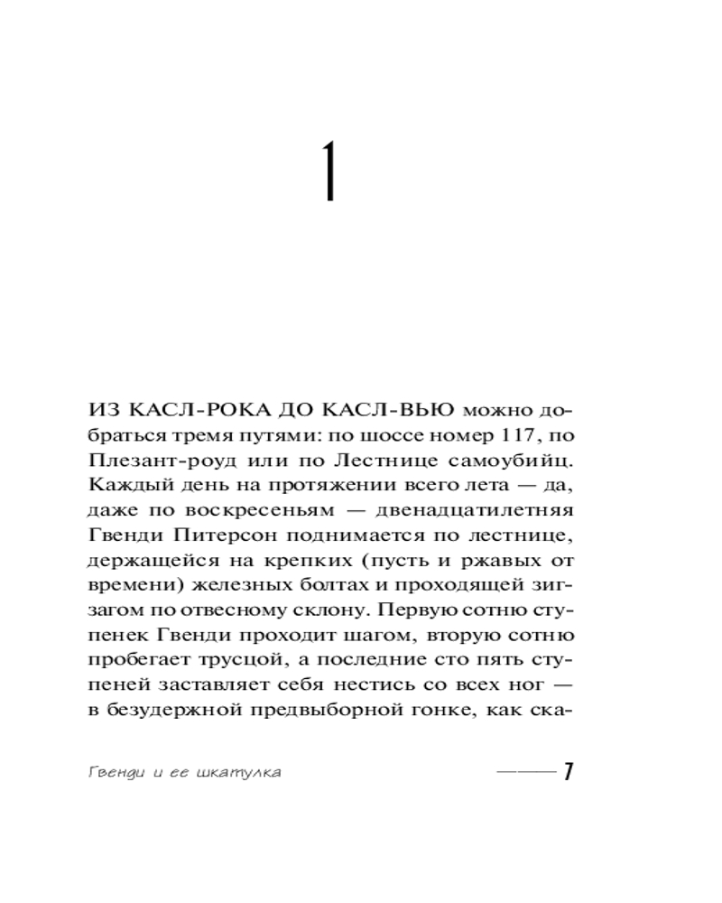 Гвенди и ее шкатулкаВ данный момент этот товар отсутствует в продаже. Возможно, у нас найдется аналогичный или похожий товар здесь. Серия: Вселенная Стивена Кинга (м) Из Касл-Рока до Касл-Вью можно добраться тремя путями: по шоссе номер 117, по Плезант-роуд или по Лестнице самоубийц. Каждый день на протяжении всего лета 1974 года двенадцатилетняя Гвенди Питерсон поднималась по лестнице, державшейся на крепких железных болтах и проходившей зигзагом по отвесному склону. |