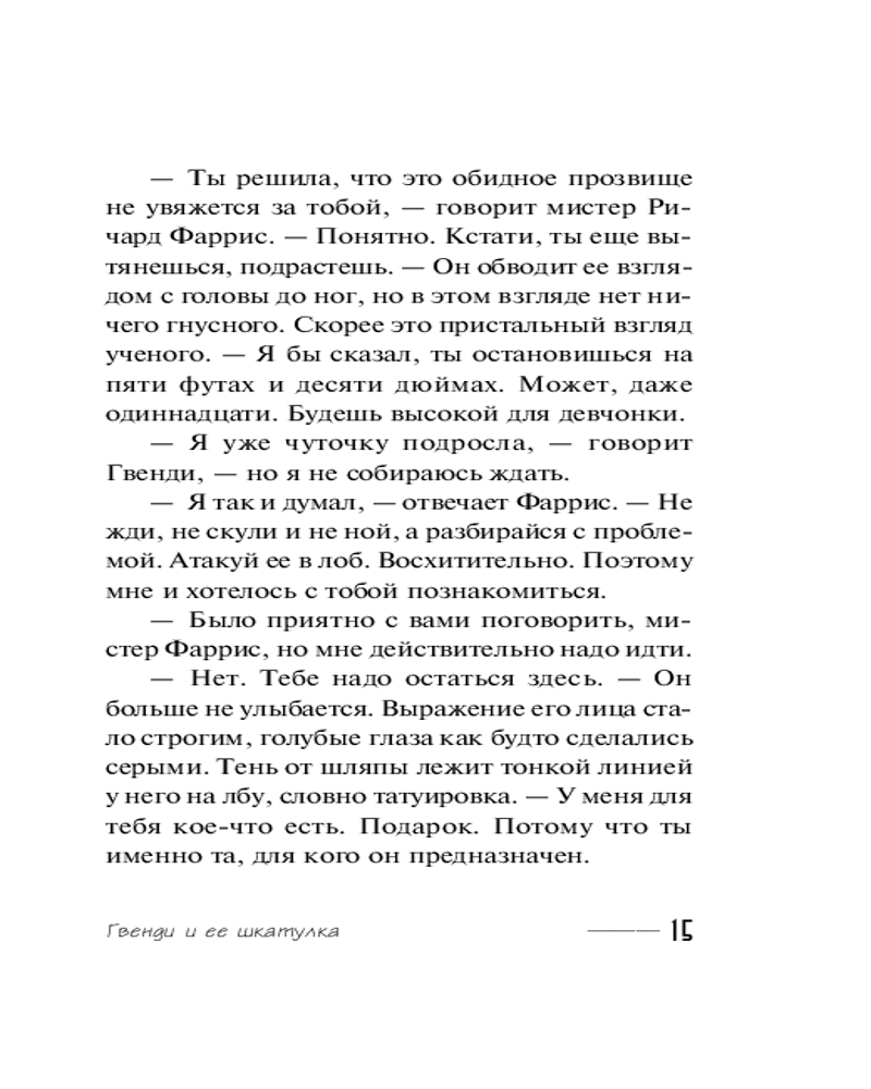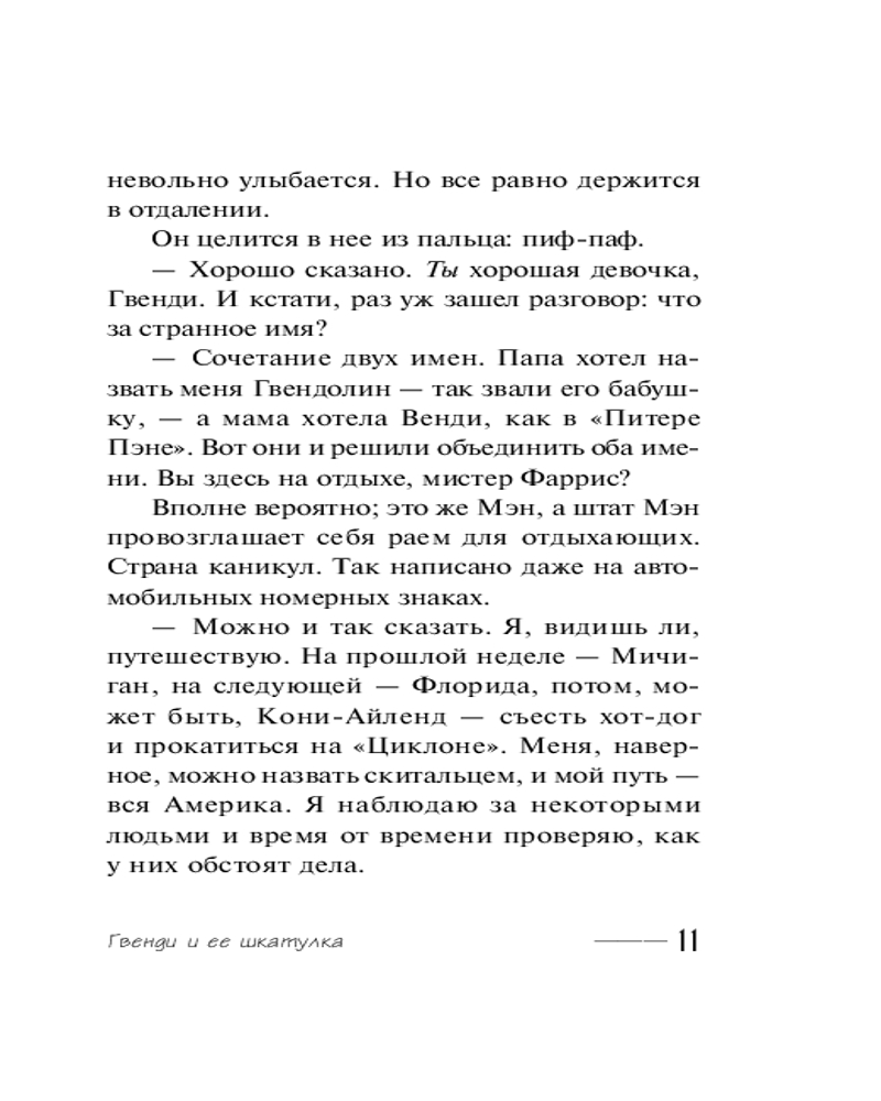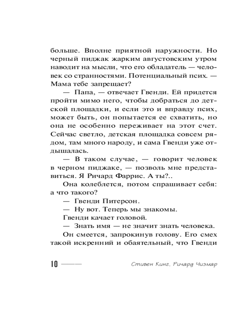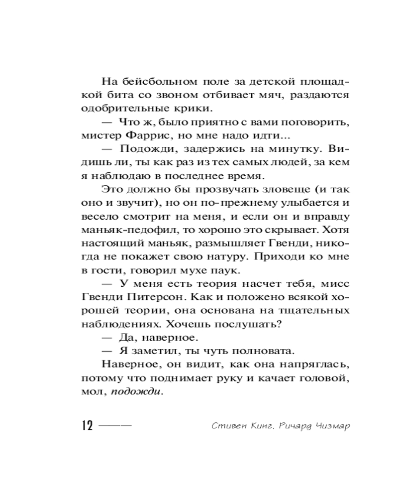 Гвенди и ее шкатулкаВ данный момент этот товар отсутствует в продаже. Возможно, у нас найдется аналогичный или похожий товар здесь. Серия: Вселенная Стивена Кинга (м) Из Касл-Рока до Касл-Вью можно добраться тремя путями: по шоссе номер 117, по Плезант-роуд или по Лестнице самоубийц. Каждый день на протяжении всего лета 1974 года двенадцатилетняя Гвенди Питерсон поднималась по лестнице, державшейся на крепких железных болтах и проходившей зигзагом по отвесному склону. |
