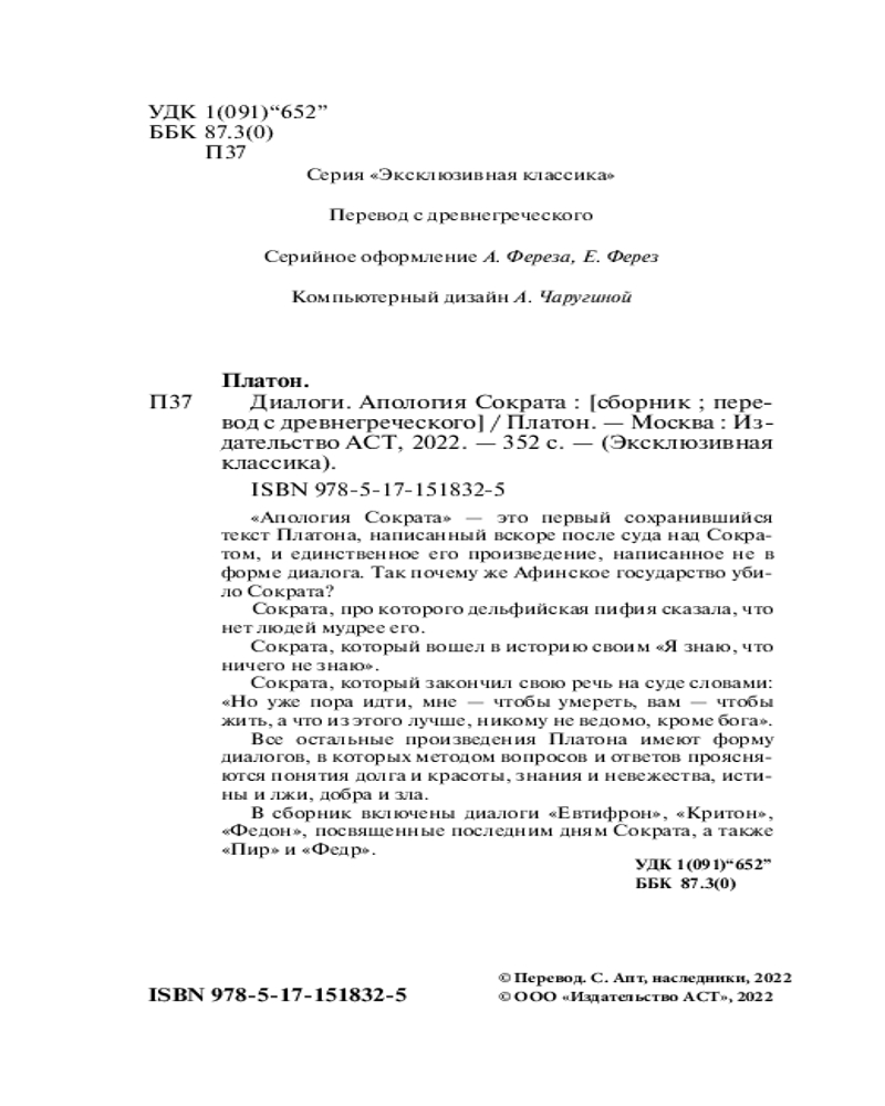 💳 Оплатить за товар можно при получении 🇰🇿 Есть бесплатная доставка по Казахстану от 1 дня 🎁 Копите бонусы с каждой покупки Серия: Эксклюзивная классика «Апология Сократа» — это первый сохранившийся текст Платона, написанный вскоре после суда над Сократом и единственное его произведение, написанное не в форме диалога. Так почему же Афинское государство убило Сократа? |
