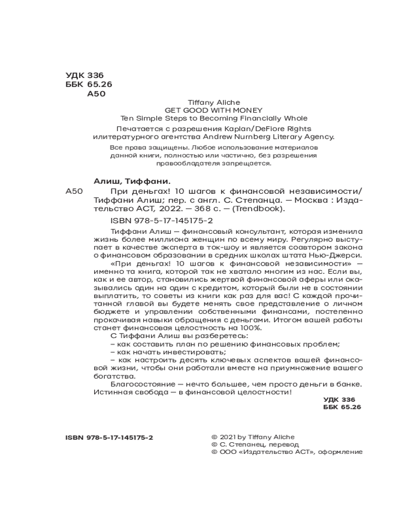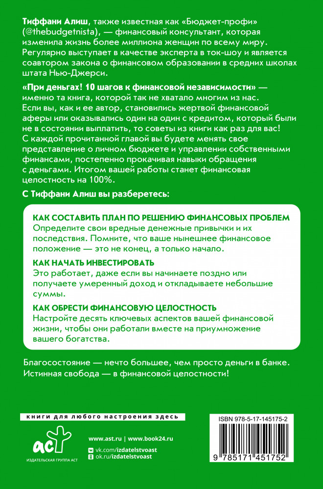 Серия: Trend book Тиффани Алиш, также известная как «Бюджет-профи» (@thebudgetnista), — финансовый консультант, которая изменила жизнь более миллиона женщин по всему миру. Регулярно выступает в качестве эксперта в ток-шоу и является соавтором закона о финансовом образовании в средних школах штата Нью-Джерси. |