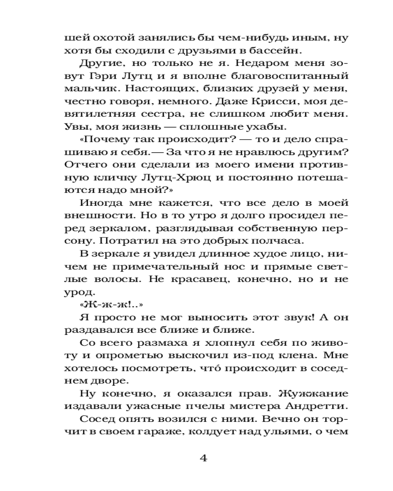 Уж-ж-жасные пчелыВ данный момент этот товар отсутствует в продаже. Возможно, у нас найдется аналогичный или похожий товар здесь. Серия: Ужастики Р. Л. Стайна Гэри Лутцу совсем не везет в жизни. У него нет настоящих друзей, соседские парни не упускают случая поколотить его. Единственный его друг — компьютер. Однажды в Интернете он нашел предложение поменять свое тело на любое другое... |