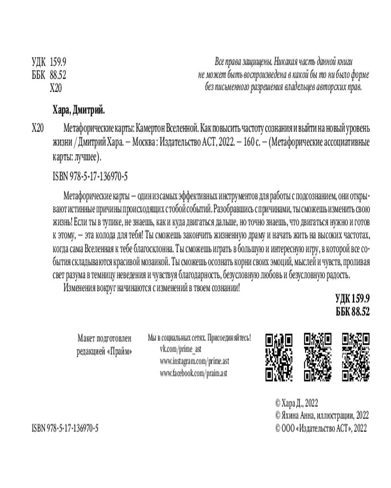 💳 Оплатить за товар можно при получении 🇰🇿 Есть бесплатная доставка по Казахстану от 1 дня 🎁 Копите бонусы с каждой покупки Серия: Метафорические ассоциативные карты: лучшее Метафорические карты — один из самых эффективных инструментов для работы с подсознанием, они открывают истинные причины происходящих с тобой событий. Разобравшись с причинами, ты сможешь изменить свою жизнь! Если ты в тупике, не знаешь, как и куда двигаться дальше, но точно знаешь, что двигаться нужно и готов к этому, — эта колода для тебя! Ты сможешь закончить жизненную драму и начать жить на высоких частотах, когда сама Вселенная к тебе благосклонна. Ты сможешь играть в большую и интересную игру, в которой все события складываются красивой мозаикой. Ты сможешь осознать корни своих эмоций, мыслей и чувств, проливая свет разума в темницу неведения и чувствуя благодарность, безусловную любовь и безусловную радость. |