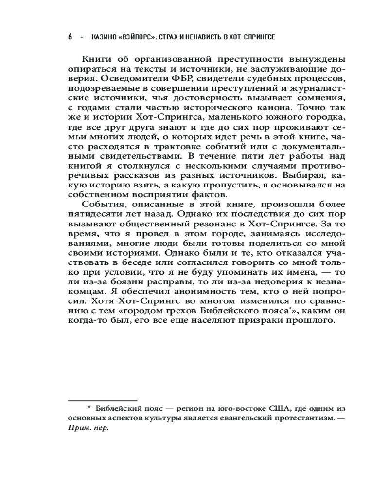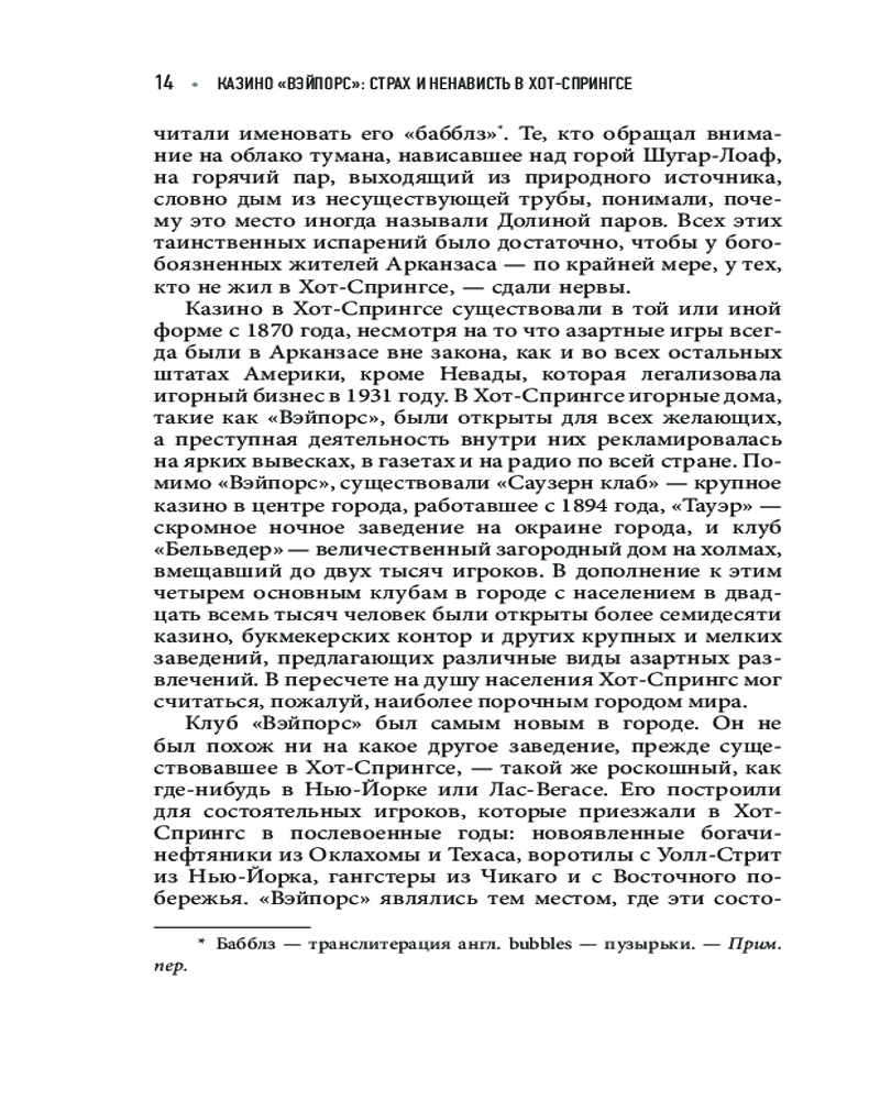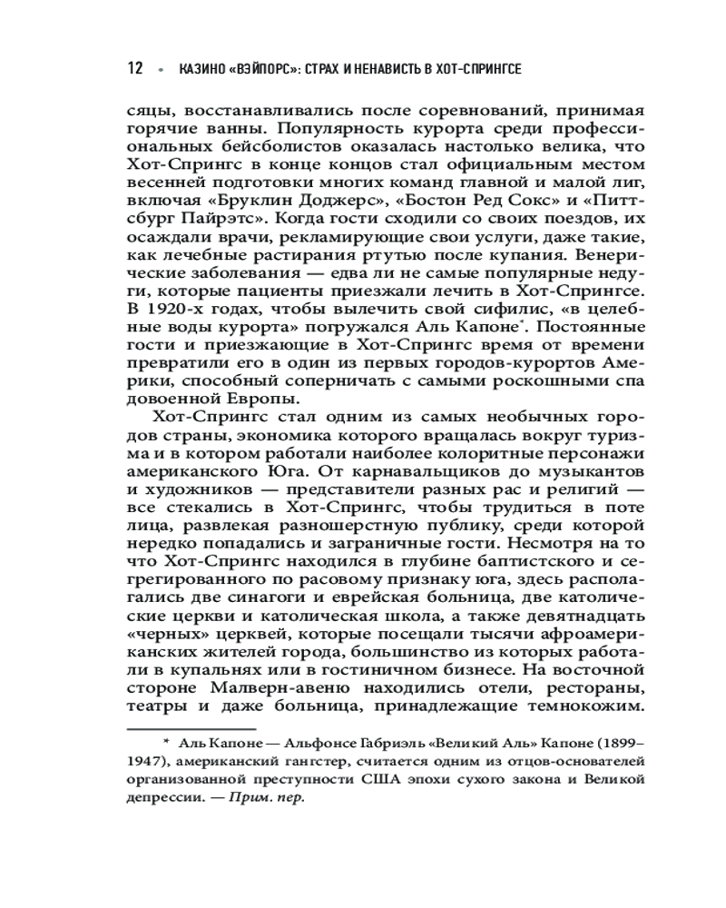 Перед читателем — история одной из самых бурных эпох в истории Америки, увиденная через призму казино «Вэйпорс». Организованная преступность, тяжелое расовое прошлое, белые гангстеры и растущий при их поддержке черный средний класс — книга рассказывает о том, как грязная изнанка Юга также стала местом, где появились первые больницы для ветеранов и бейсбольные площадки, давшие дорогу легенде бейсбола Бейбу Руту и президенту Биллу Клинтону. Переполненное джазовыми артистами, аукционистами, игровыми автоматами и костюмированными комиками, казино «Вэйпорс» — это окно в мир старой Америки с ее неповторимым духом. |