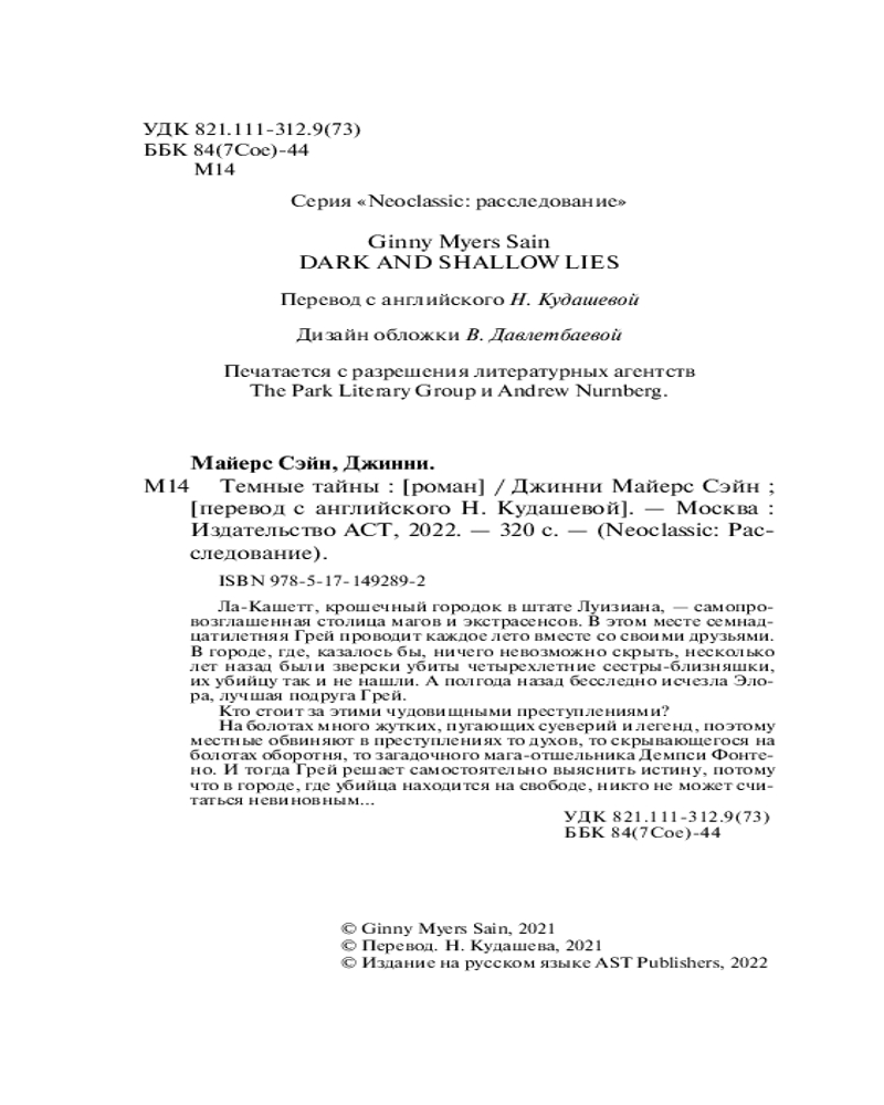 💳 Оплатить за товар можно при получении 🇰🇿 Есть бесплатная доставка по Казахстану от 1 дня 🎁 Копите бонусы с каждой покупки Серия: Neoclassic: Расследование Ла-Кашетт, крошечный городок в штате Луизиана, — самопровозглашенная столица магов и экстрасенсов. В этом месте семнадцатилетняя Грей проводит каждое лето вместе со своими друзьями. В городе, где, казалось бы, ничего невозможно скрыть, несколько лет назад были зверски убиты четырехлетние сестры-близняшки, их убийцу так и не нашли. А полгода назад бесследно исчезла Элора, лучшая подруга Грей. |